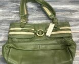 The Adrienne Vittadini Jungle Green Print Leather Shoulder Bag Purse is a stylish and versatile accessory for women. The large size and double handles make it perfect for casual occasions, while the animal print pattern adds a trendy touch. Made from high-quality leather with a fabric lining, this satchel/top handle bag features a magnetic closure and silver hardware accents. The green exterior and lining colors, along with the buckle accent, give this purse a chic and fashionable look. Perfect for adding a pop of color to any outfit, this new with tag bag comes with its original dust bag.