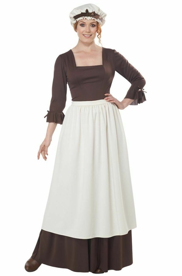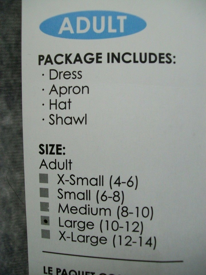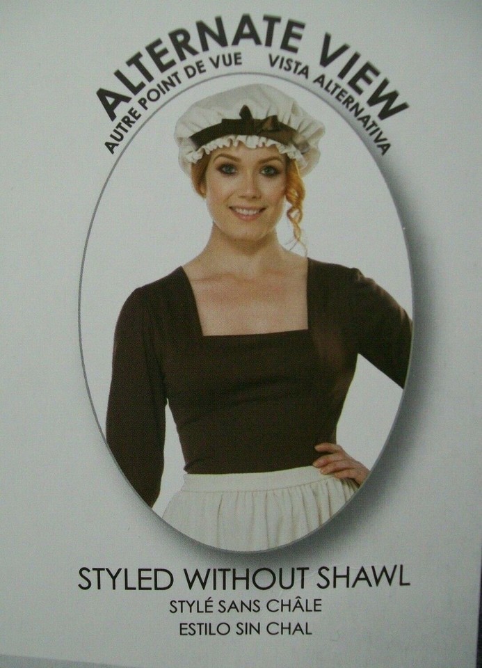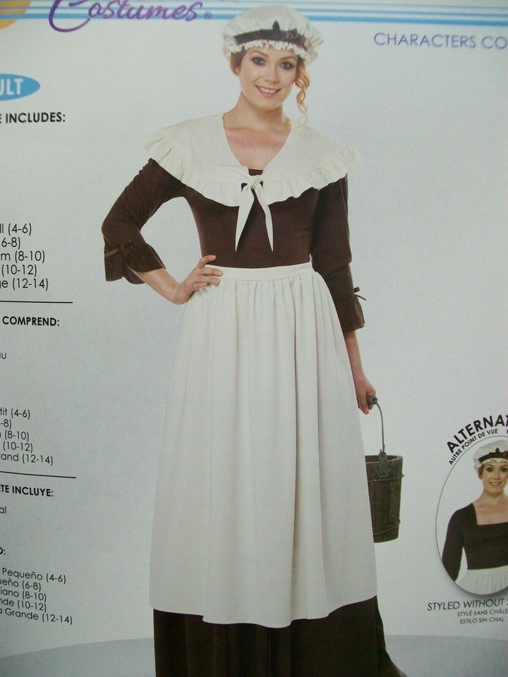 Colonial Village Woman Themed costume. Two looks in one. Wear just the dress or dress with the shawl. Brown Dress with Cream / Ivory color hat, shawl, and apron. Please see all photos. I do see through the packaging that there are some long threads that will need trimmed. For ages 14 and up. Does not include wig, Shoes, or Bucket. Would great for many costumes, Thanksgiving Plays, Pretend, etc. Costume Suggestions; Colonial Woman, Medieval Peasant, Commoner, Renaissance Village Lady, Servant, Maid, Pilgrim, Betsy Ross, Tavern Wench, Inn keeper, etc.