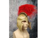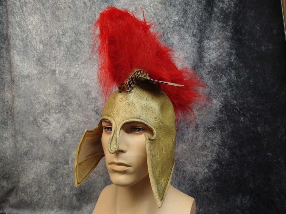 Latex Greek Helmet. Gold Helmet with textures. Adult: One Size Fits Most. Has a red faux fur hair crest / brush. Crest is kind of unruly and folded on the end. Keeps flopping over so it may need some reinforcing. on the Inside you can see foam in various areas. The side and bottom pointed edges of the helmet tend to sway outward away from the face. If you want it to hug the face you may opt to apply a skin safe double sided tape or for more long term wear use a skin safe latex or appliance adhesive. (Neither included and I would suggest those options only to those with makeup and f/x appliance experience) Great costume accessory for Halloween or school play: Greek Warrior, Galea for Guard, Greek Soldier, Trooper, Gladiator, Troy, Spartan, Warrior, etc.