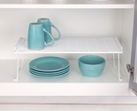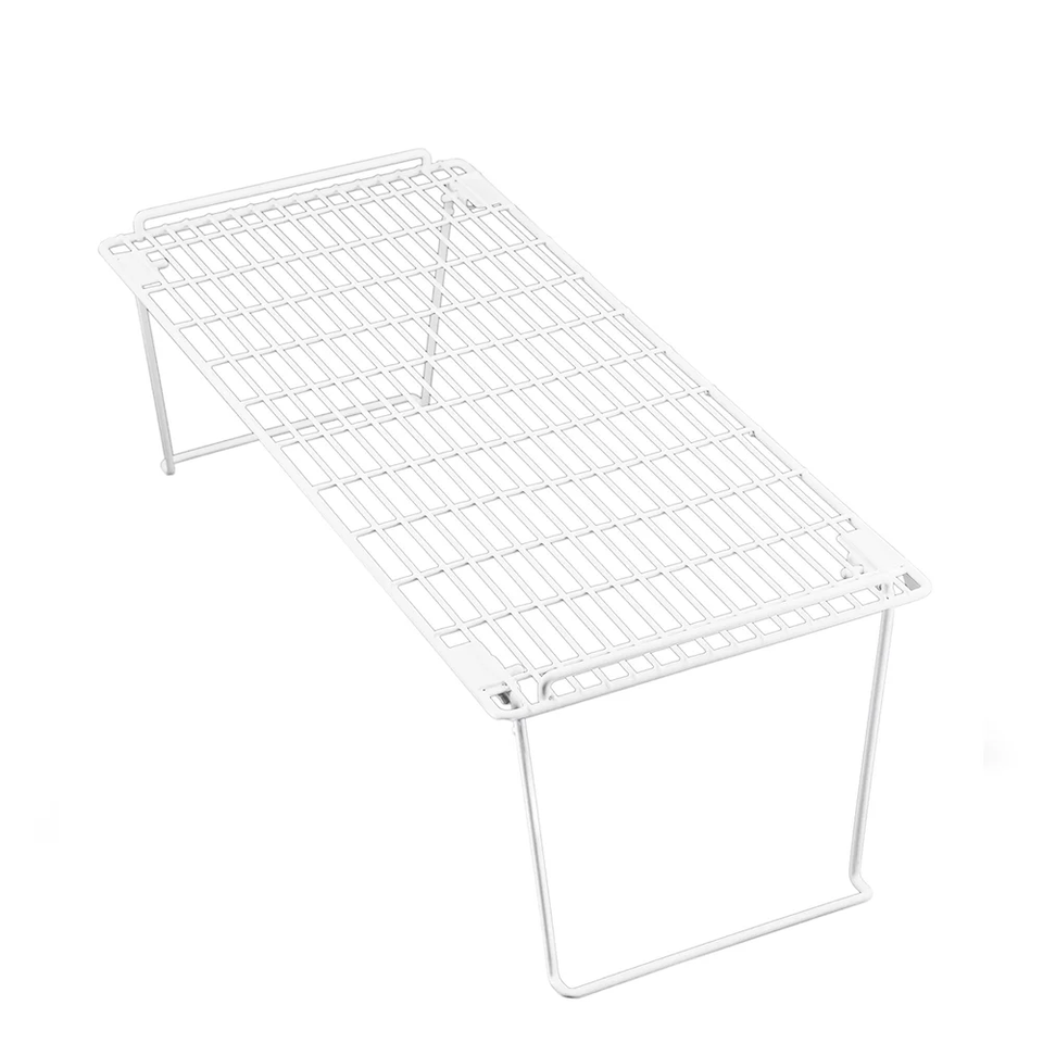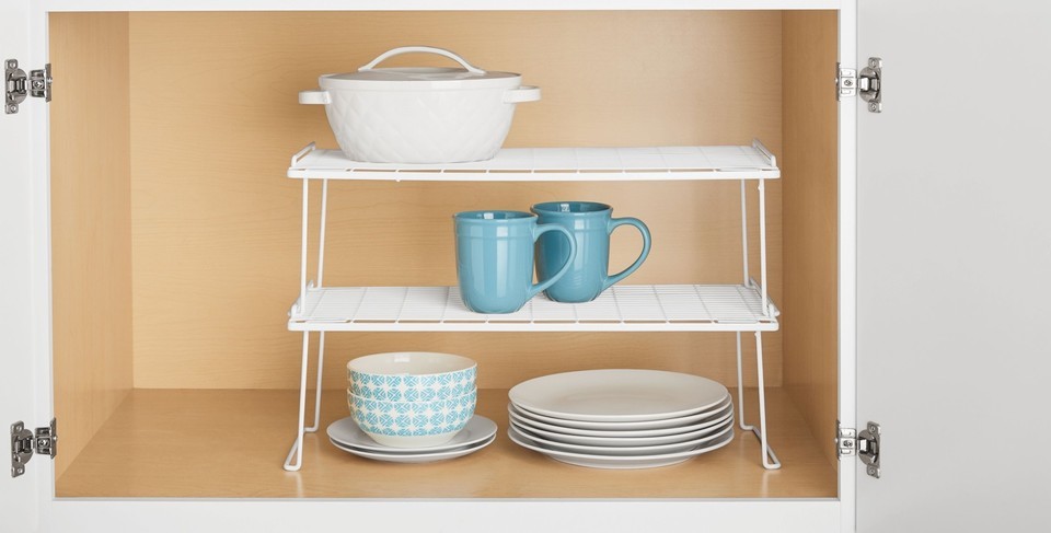 Kitchen organizer designed to hold a variety of kitchenware Features stacking ability Shelves stack to maximize storage space for cabinets and counters Accommodates plates, lids, cutting boards, pans and more Neutral white color Rust-resistant finish Measures 22" W x 10" D x 7" H