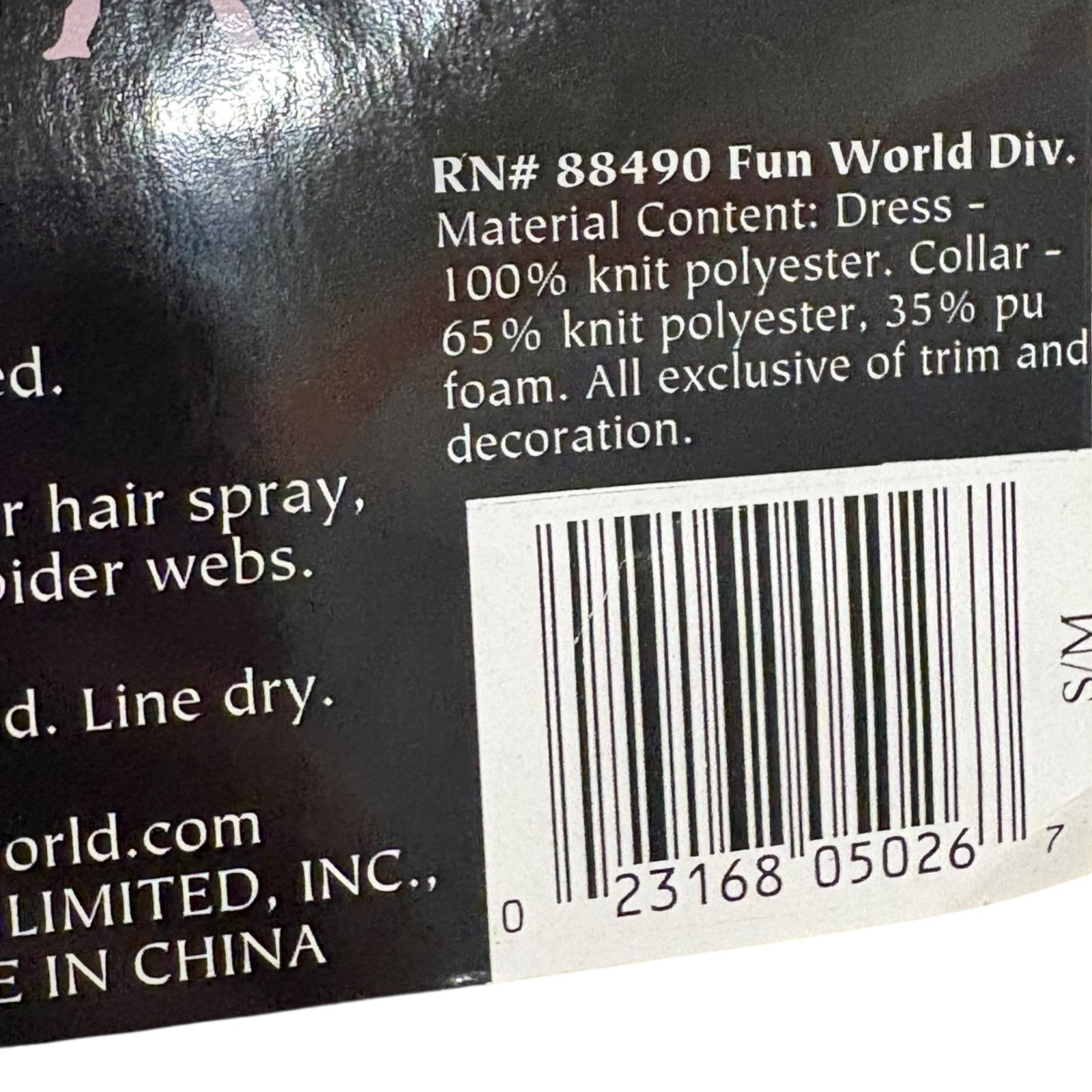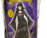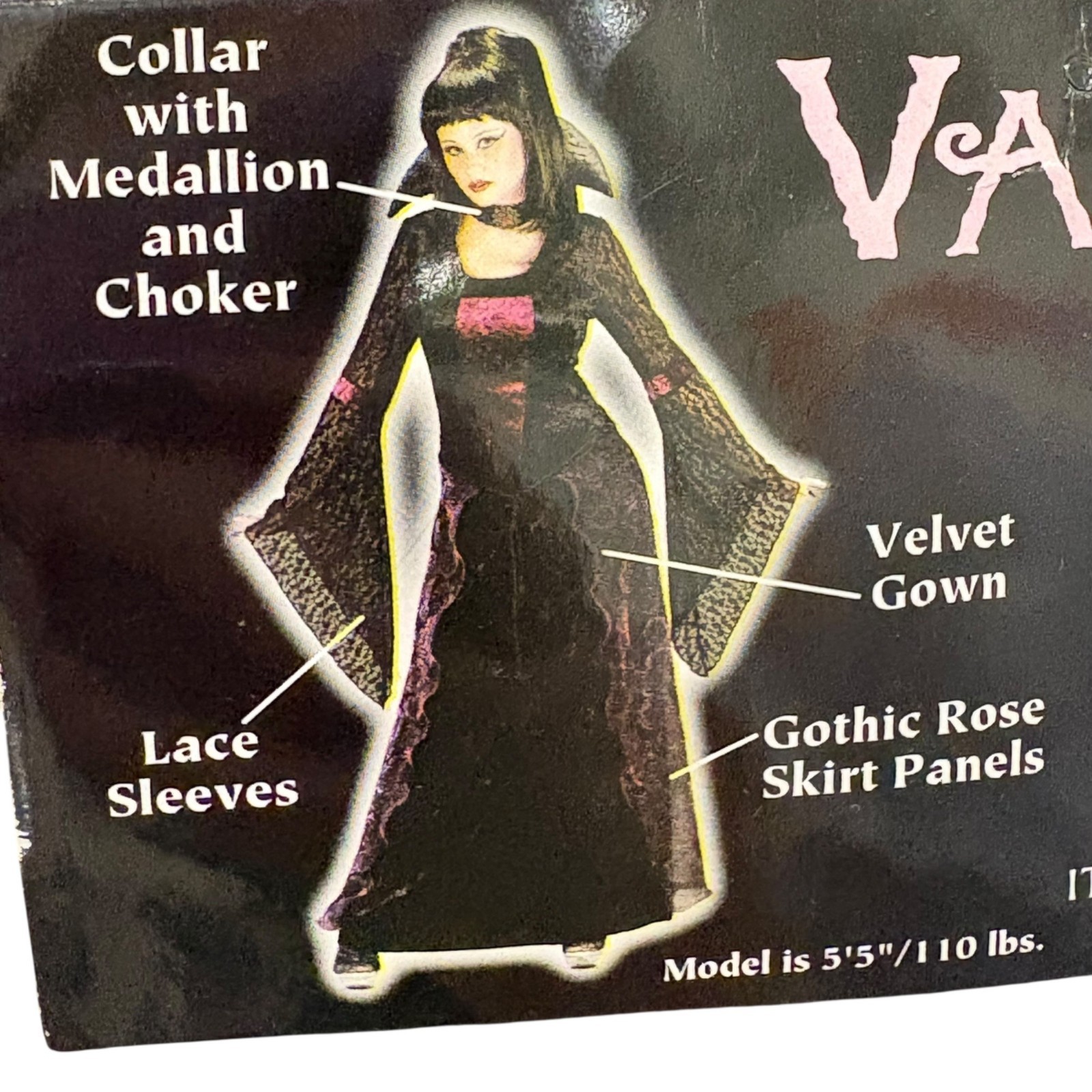 This Vampressa costume offers a captivating look with its velvet gown and lace sleeves. Perfect for Halloween or themed parties, it includes a collar with an attached choker and medallion, adding a touch of mystery to your attire.