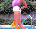 The big bust 1980's-'90's Hall of Fame adult superstar wears a purple tank top, white short shorts and high heels in this first of three flirty poolside portraits.