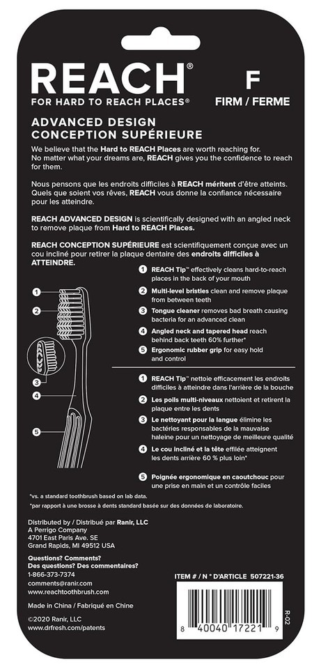 Reach Advanced design toothbrushes are scientifically designed with a signature angled neck and tapered head to clean hard to Reach places. These toothbrushes feature bi-level bristles to help clean and remove plaque between teeth and along the gum line. The signature angled neck extends behind back teeth 60% further than other leading brushes. Reach Advanced design toothbrushes also feature an ergonomic rubber grip for better comfort and control with brushing.