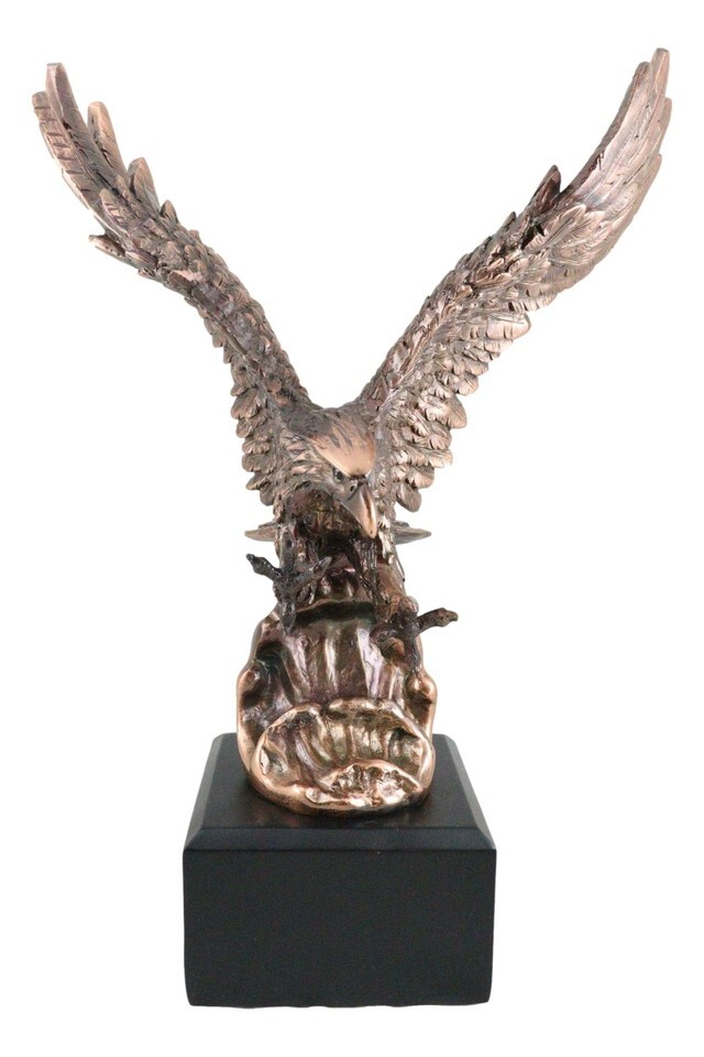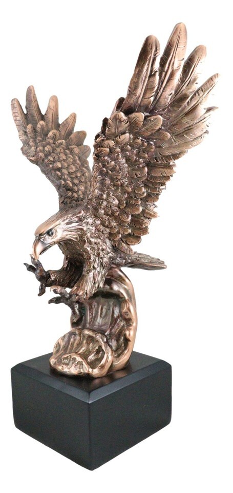 ? Featuring the majestic wings of glory, the bald eagle is designed here with a swooping posture; wings spread out, talons clawed out and vision focused at its prey. Our impressive, 360-degree, bronze electroplated resin figurine is expertly finished with a hand-applied, classic sepia bronze patina and polish to bring out the amazing detail from its feathers to its talons.