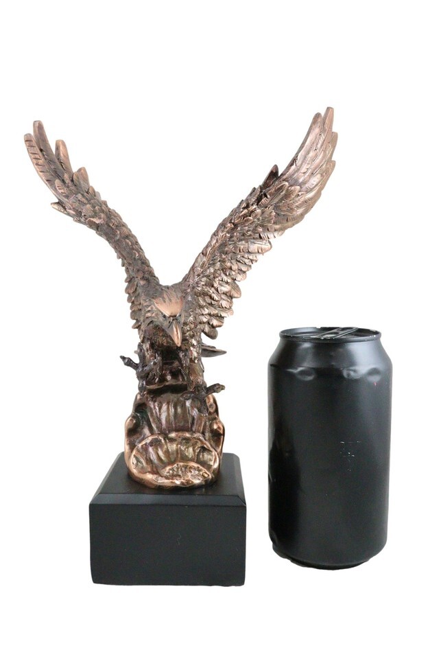 ? This Majestic Bald Eagle Figurine is made of the highest quality resin, undergoing the process of bronze electroplating giving it a uniform shine on the inside as well as the surface of the figurine. To add sculptural aesthetics and display worthiness, we add accent faux black wooden base to the sculpture.