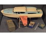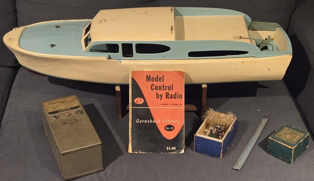 The items in the image are a vintage Aerokits Sea Queen 29-inch cabin cruiser model boat and accompanying vintage radio control (RC) equipment from the 1950s or 1960s.