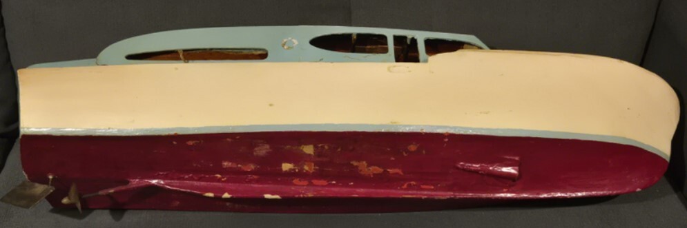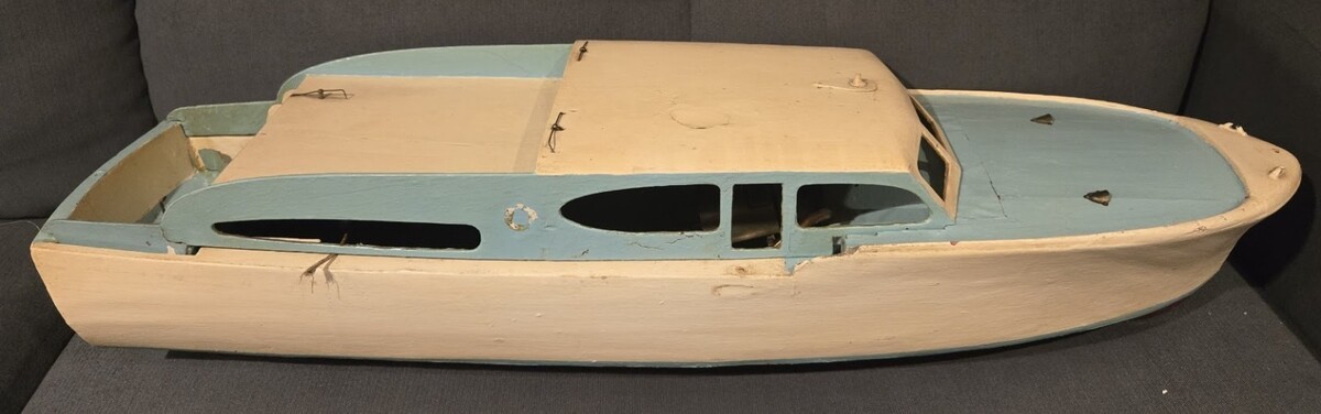 The boat is likely built from an Aerokits Sea Queen kit, a popular vintage wooden model kit.