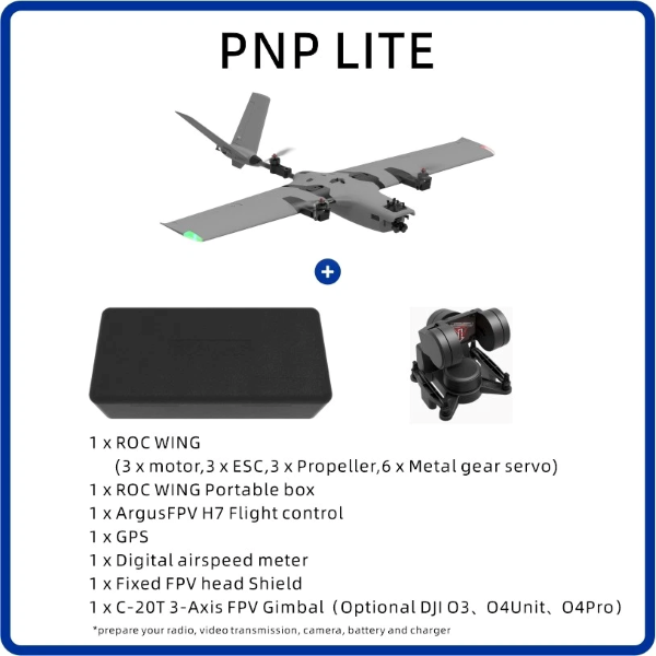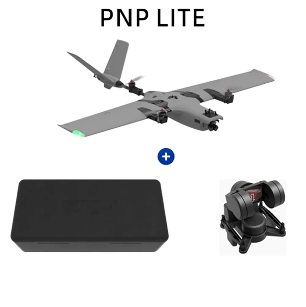 PNP PRO: (including VTOL Drone + flight control + digital airspeed indicator + power + servo + suitcase + A1 image transmission (35KM)); Users need to bring their own: battery (optional), charger, remote control (built-in image transmission lens+ground image transmission receiver, only need to add remote control and battery for long-distance navigation and route planning)