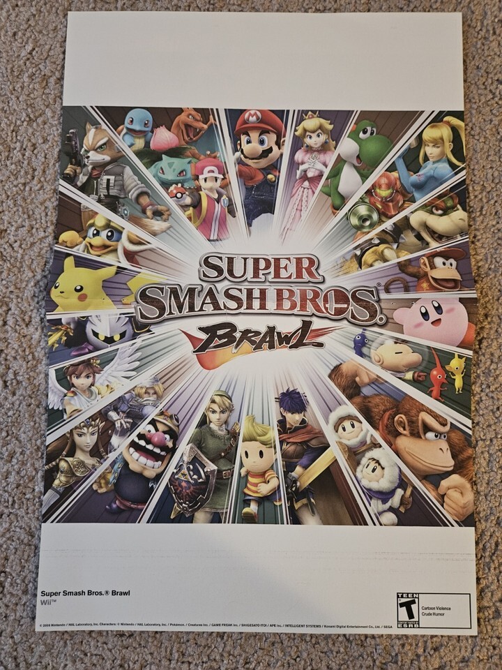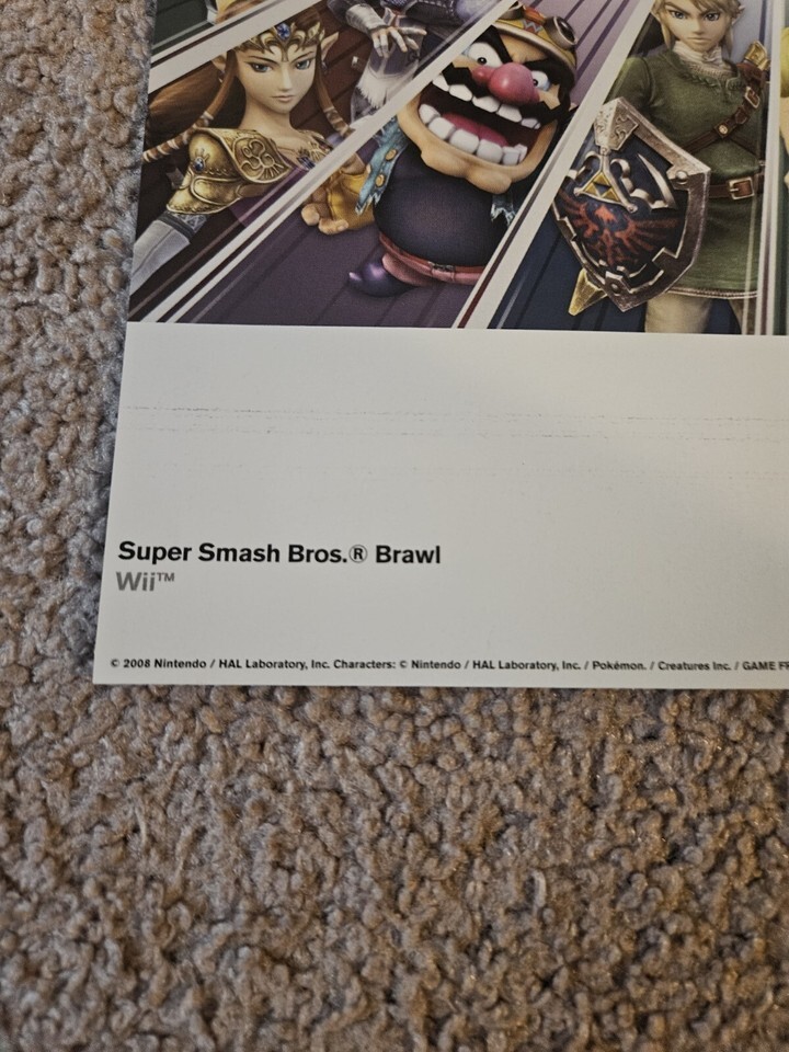 Il s'agit d'une affiche double face de 15,5 x 11,5 pouces pour Super Smash Bros. Brawl et Super Paper Mario. Il a un pli au milieu car il provient d'un magazine d'affiches Nintendo Power. Il est en bon etat.