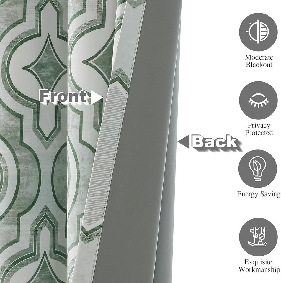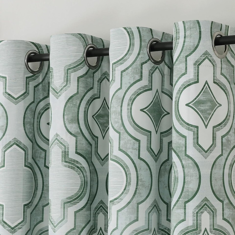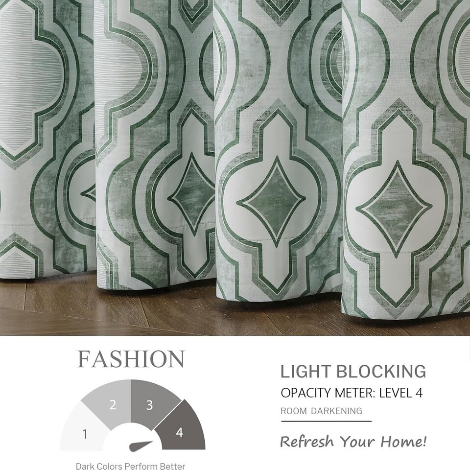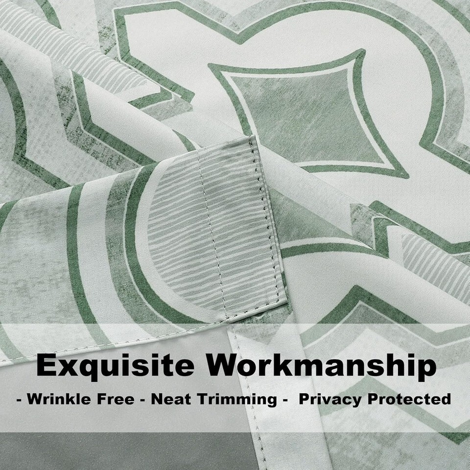 Airwill Blackout Curtain Green Geometric Design 84" Length, 52" Width, Set of 2 Panels Easy Install About this item Ready-Made and Sold in Pairs: Package includes 2 panels of 52" x 84" each Utility Function: triple weave fabric construction blocks out 75%~80% light and UV rays, regulates temperature, provides privacy protection, and reduces noise Moroccan Geometric Design: classic geometric print composed of hexagons adds elegance to your decor. Eight silver grommets create a modern design and easy installation Retro Vintage Pattern: contemporary and stylish geometric pattern mixes light and dark gray tones against a white background, creating a modern aesthetic Triple Weave Fabric: Ideal for a nursery, bedroom, living room, office studio, apartment dorm, or any other windows that need the perfect finishing touch Color Retro Vintage Geometric, Green Opacity Blackout Room Type Bedroom, Dining Room, Home Office, Living Room, Nursery Style Name Modern Pattern Solid Theme Art, Fashion Curtain Form Drapes top-style Grommet Seasons All Season, Autumn, Spring, Summer, Winter Material Type Triple weave thermal insulated 100 blackout Weave Type Plain Product Care Instructions Do Not Bleach, Do Not Soak, Dry In Shade, Low Iron, Tumble Dry Lining Description Unlined Water Resistance Level Not Water Resistant Measurements Item Dimensions L x W 84"L x 52"W Size 52"W x 84"L (Pack of 2) Features Specs Additional Features Fade Resistant, Long Lasting, Stain Resistant, UV Protection, Wrinkle Free Fits Rod Size 1.6 Inches Important information Safety Information Avoid using bleach and do not soak the curtains when washing. Always follow the care instructions to ensure the longevity and safety of the product. Shipping Weight is 3 lbs 14 ounces.