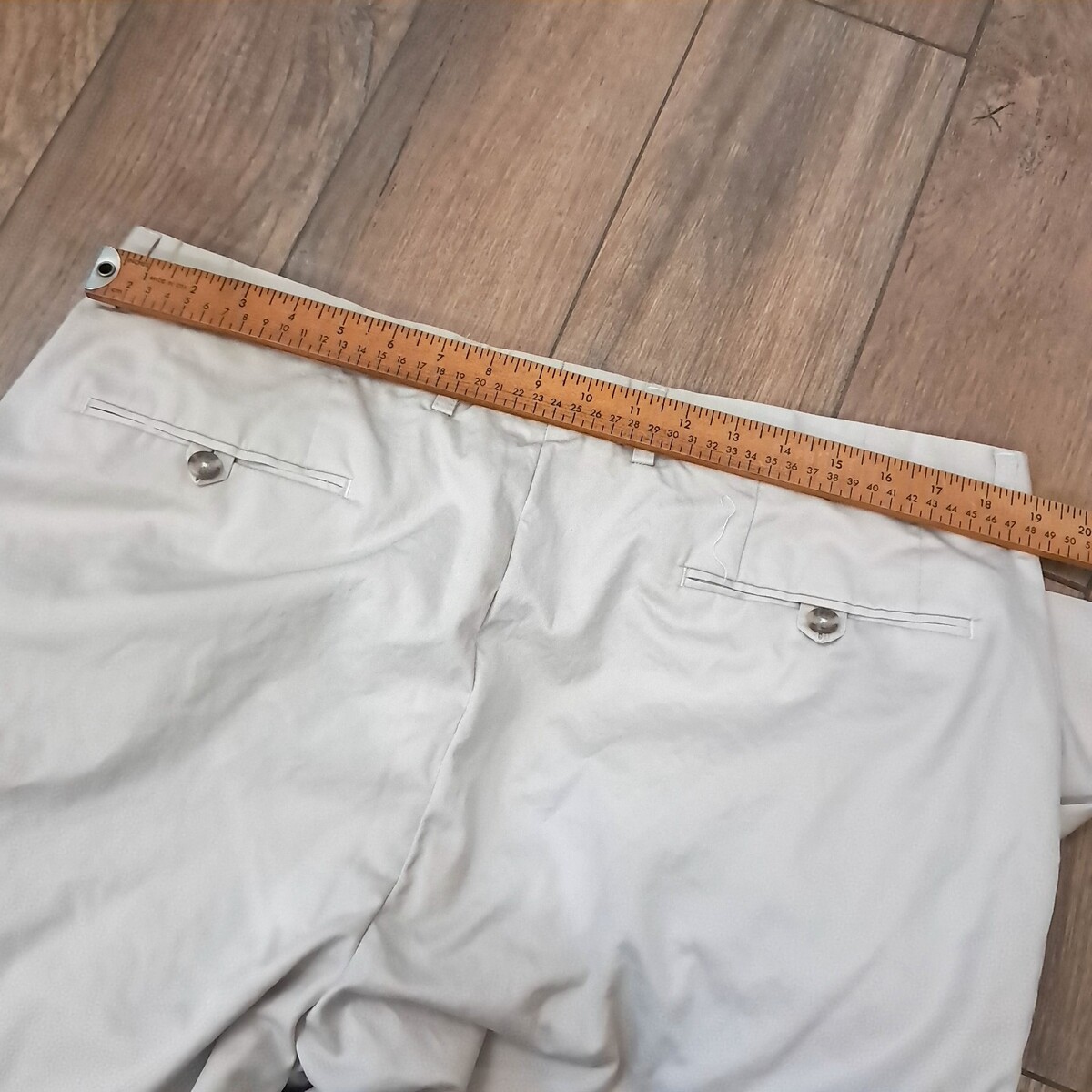 Cream/ivory/light tan color. Flat Front. Small spot on back of waist band as shown. Otherwise very good to excellent condition. See pics for measurements.