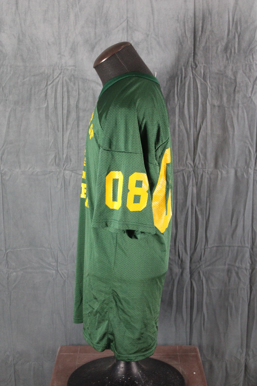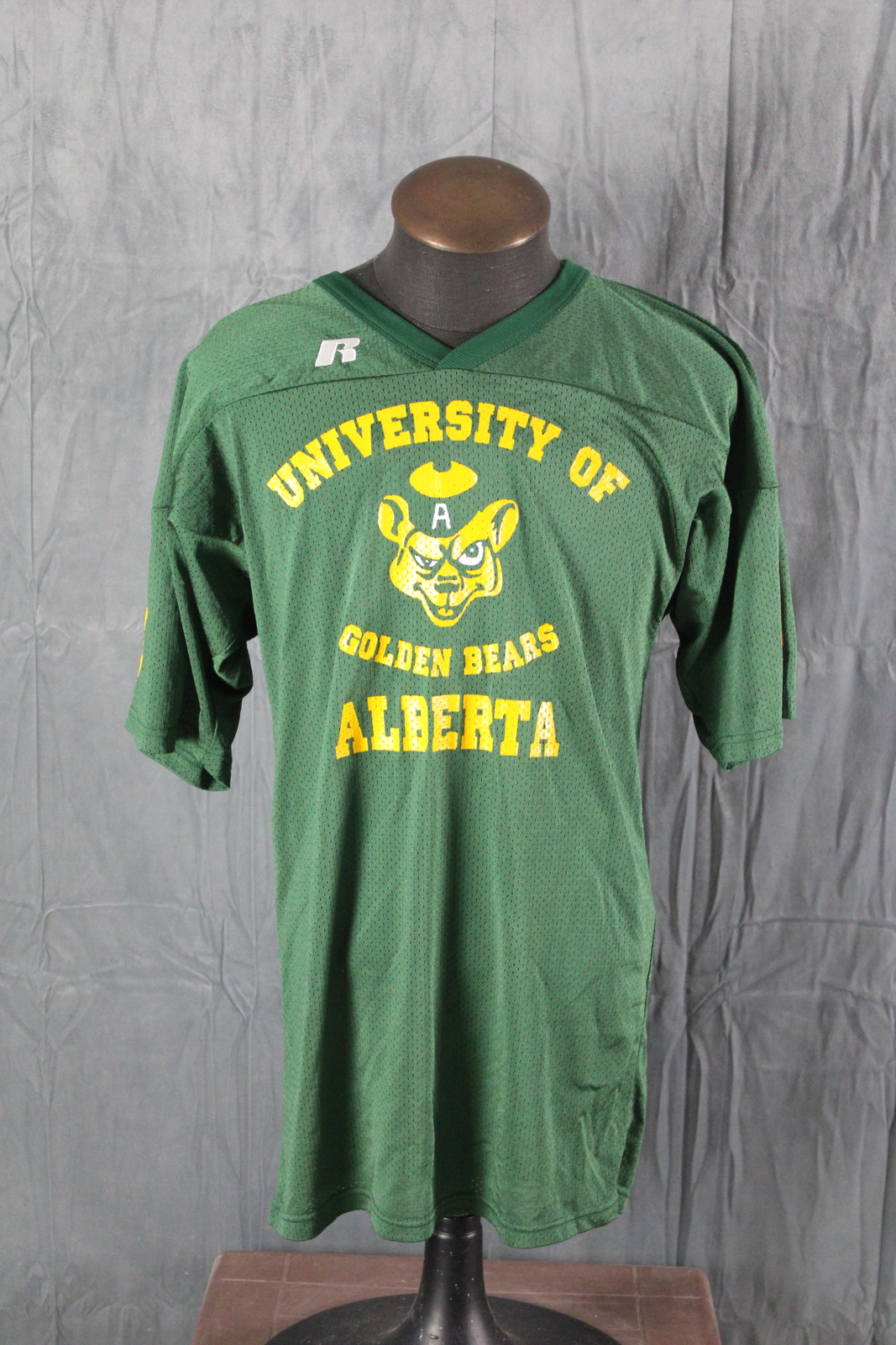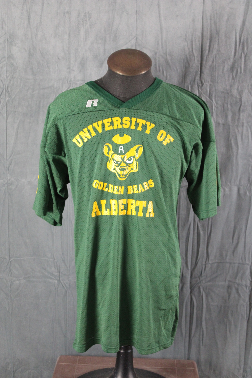 Up for sale is a retro Alberta Golden Bears jersey by Russell Athletic. It has a green base colour with the Alberta Golden Bears logo screened on the chest in yellow. Each sleeve and the back of the jersey has 08 screened on in yellow. What a great jersey do not miss out on it.