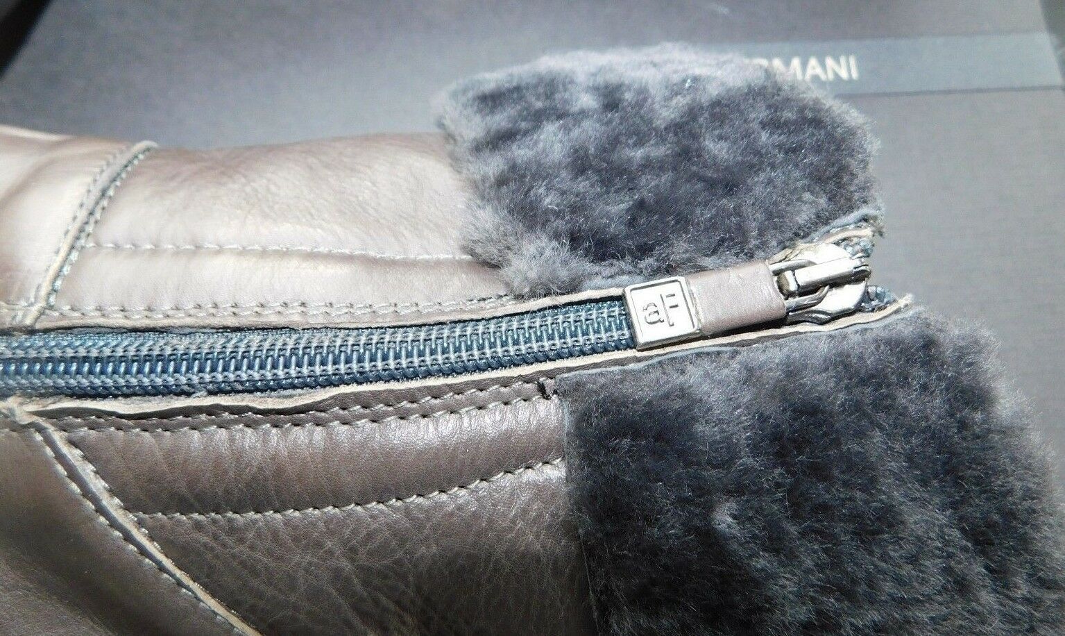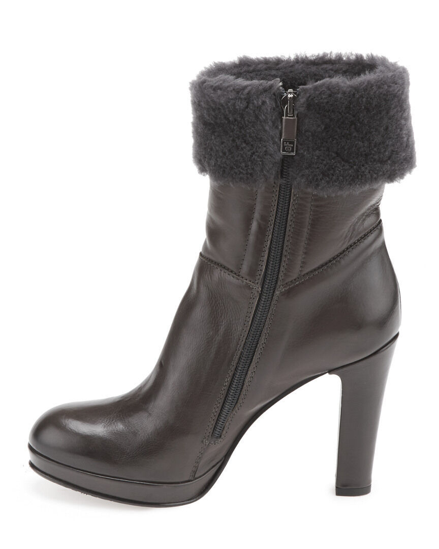 gray brown Calfskin leather platform boot with shearling cuff trim and gunmetal hardware