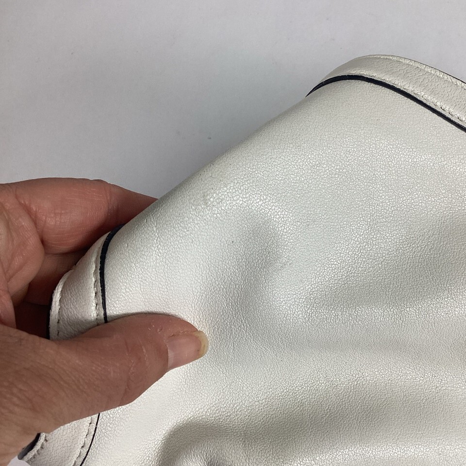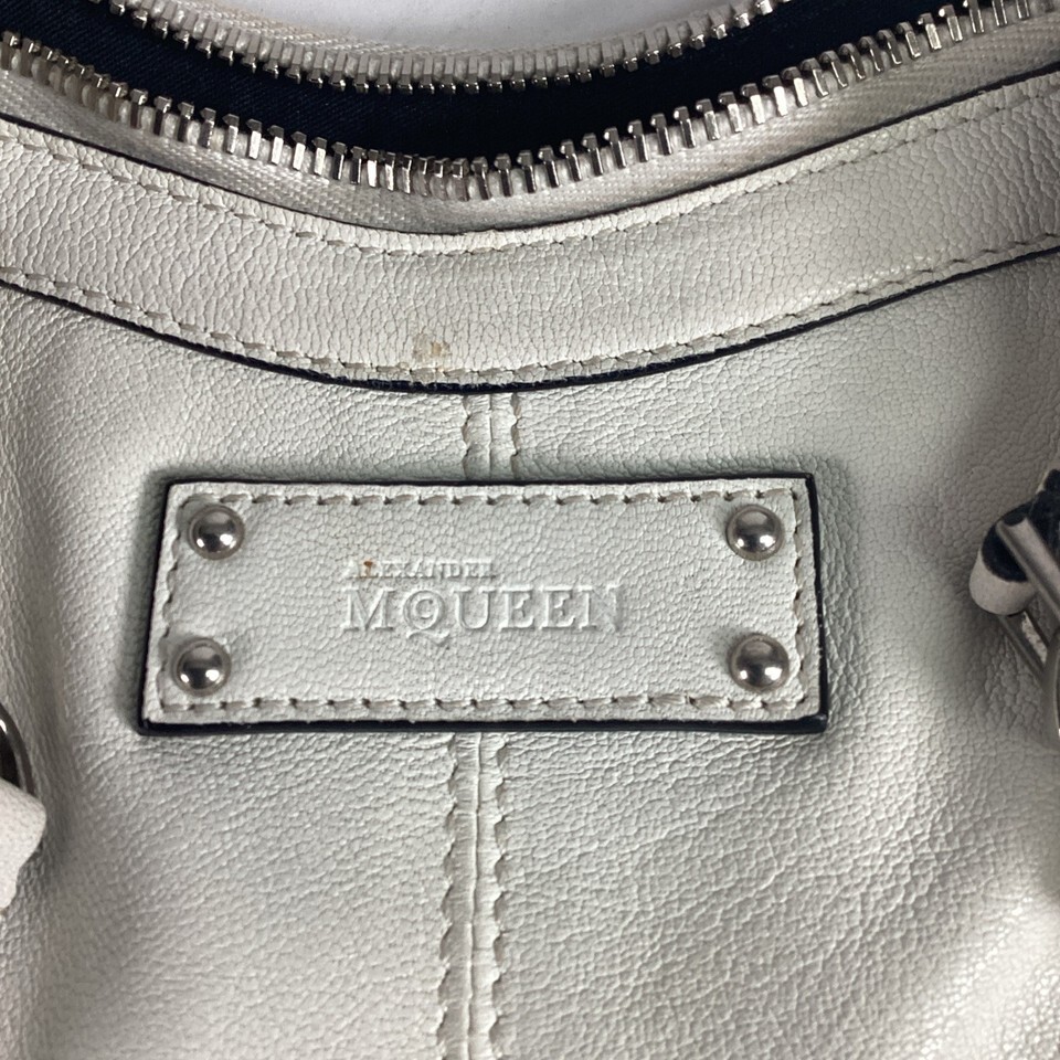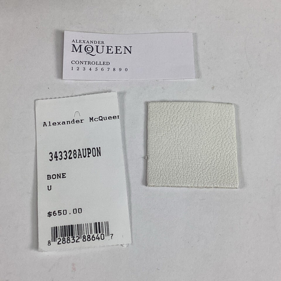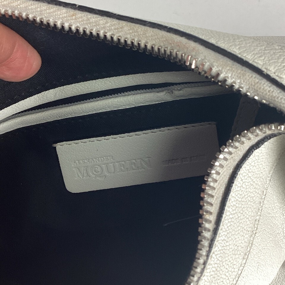 Alexander McQueen De Manta White Leather Clutch in good condition overall. It does have some stains on the front and back from normal use. It comes with a small sample square of leather and 2 tags. This bag measures 11.5x7?. The zippers work well.