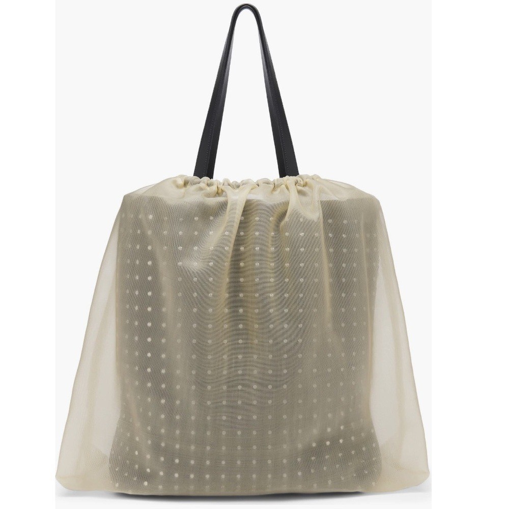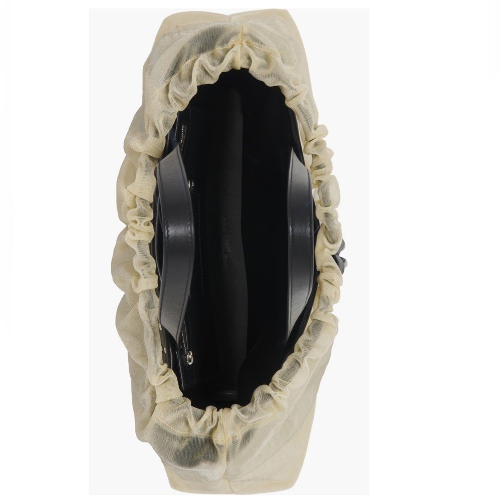 An overlay of loosely draped sheer tulle envelops this studded goatskin-leather tote, lending a ghostly whisper to the edgy carryall.