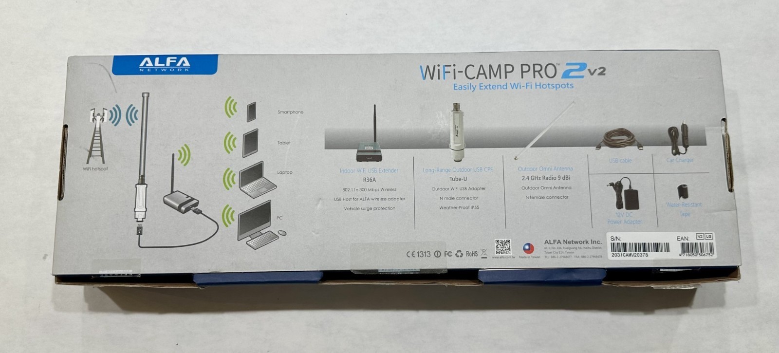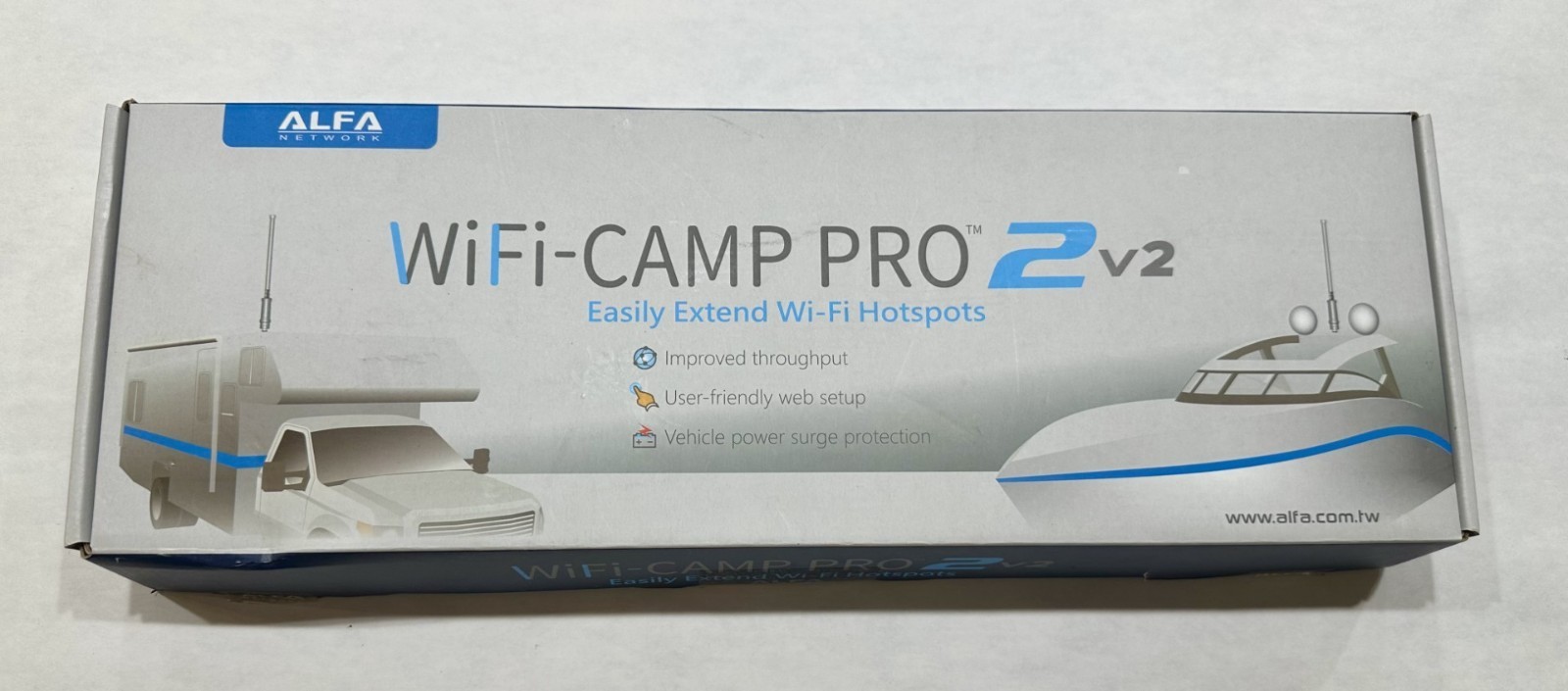 Upgrade your connectivity on the road or water with the Alfa WiFi Camp Pro 2 v2 Kit. This complete set is designed to capture distant WiFi signals and extend them for use in your RV, boat, or remote location.