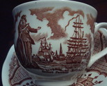 Alfred Meakin Staffordsire England "Fair Winds"cup and saucer, red transferware, original copper engravings depicting Historical Scenes of America, cup is "Sailor's Farewell" and the New York State Seal, and saucer is "New York Harbor 1930" and "E Pluribus unum" (Out of many, one -the motto of the US) cup measures 3" tall by 3 1/2" and saucer is 5 1/2" diam. excellent condition no damage [95b-bsktrack5]
