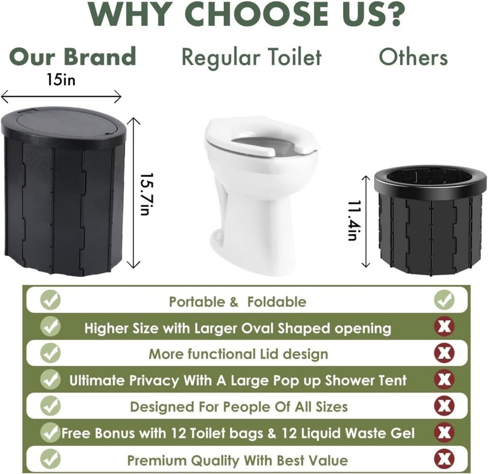 Set Includes: Portable Toilet,Pop Up Privacy Tent,Liquid Waste Gel,Toilet Bags
