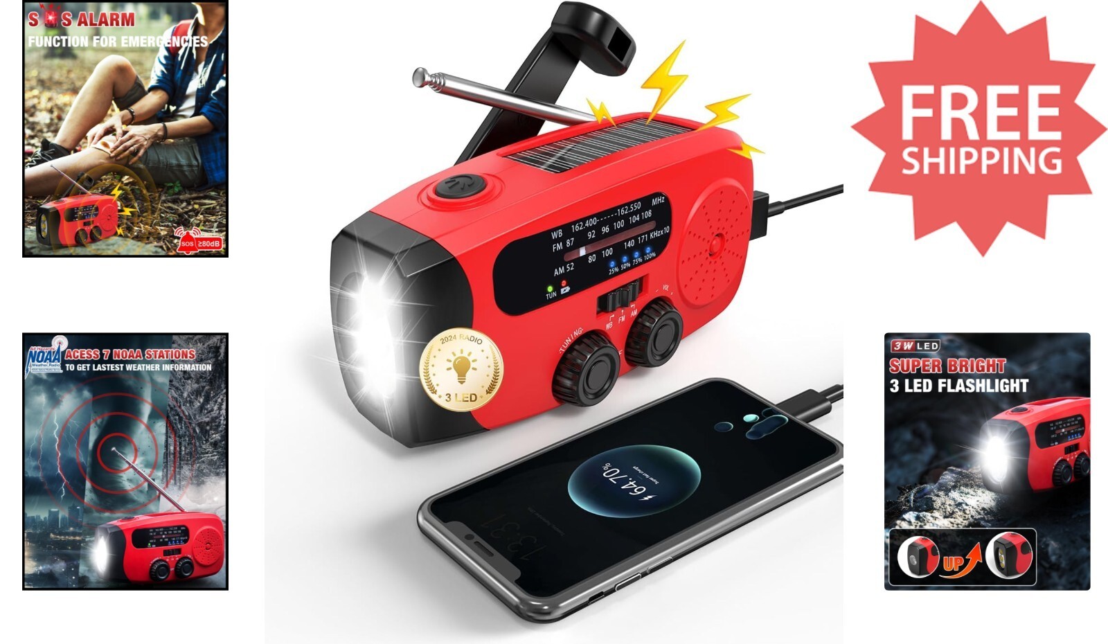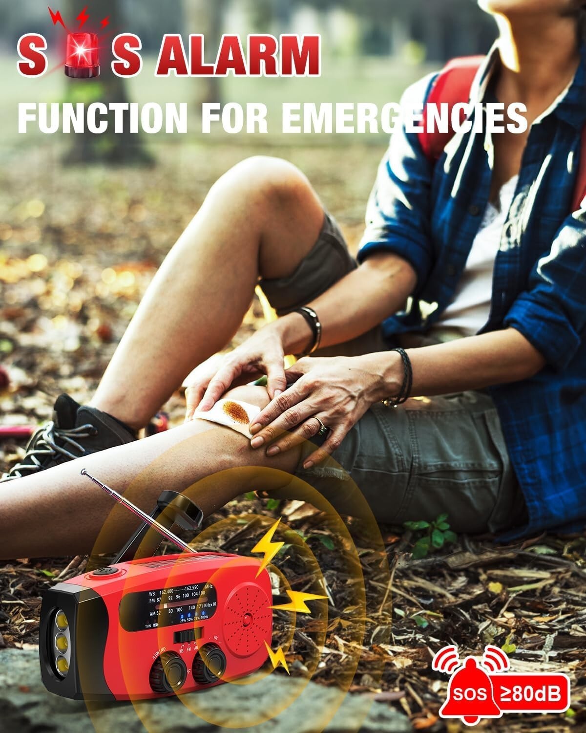 - All-in-One Emergency Radio: Red Hand Crank, 2000mAh & SOS Flashlight - Compact