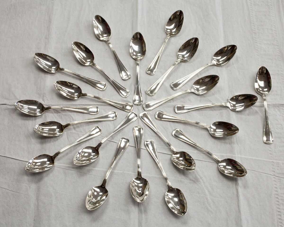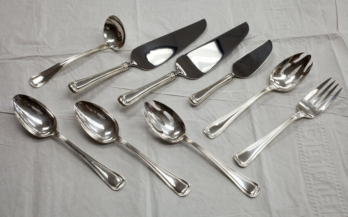 Stücke sind in gut gebrauchten Zustand. Kürzlich poliert. Keine Monogramme. Weitere Informationen finden Sie in Fotos.