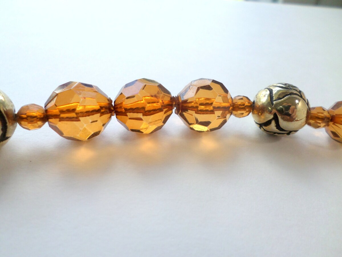 ?Style/Features: Strung on gold chain not string, deep rich amber color, rose etched gold beads