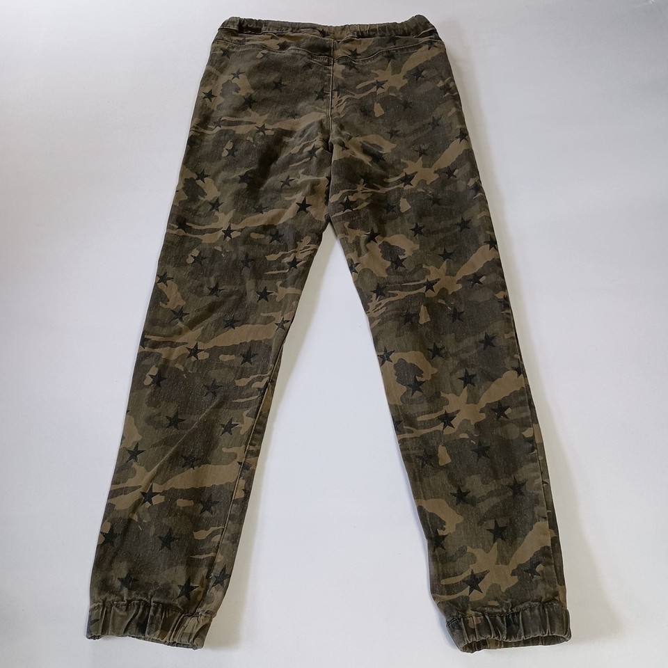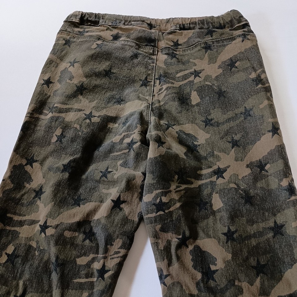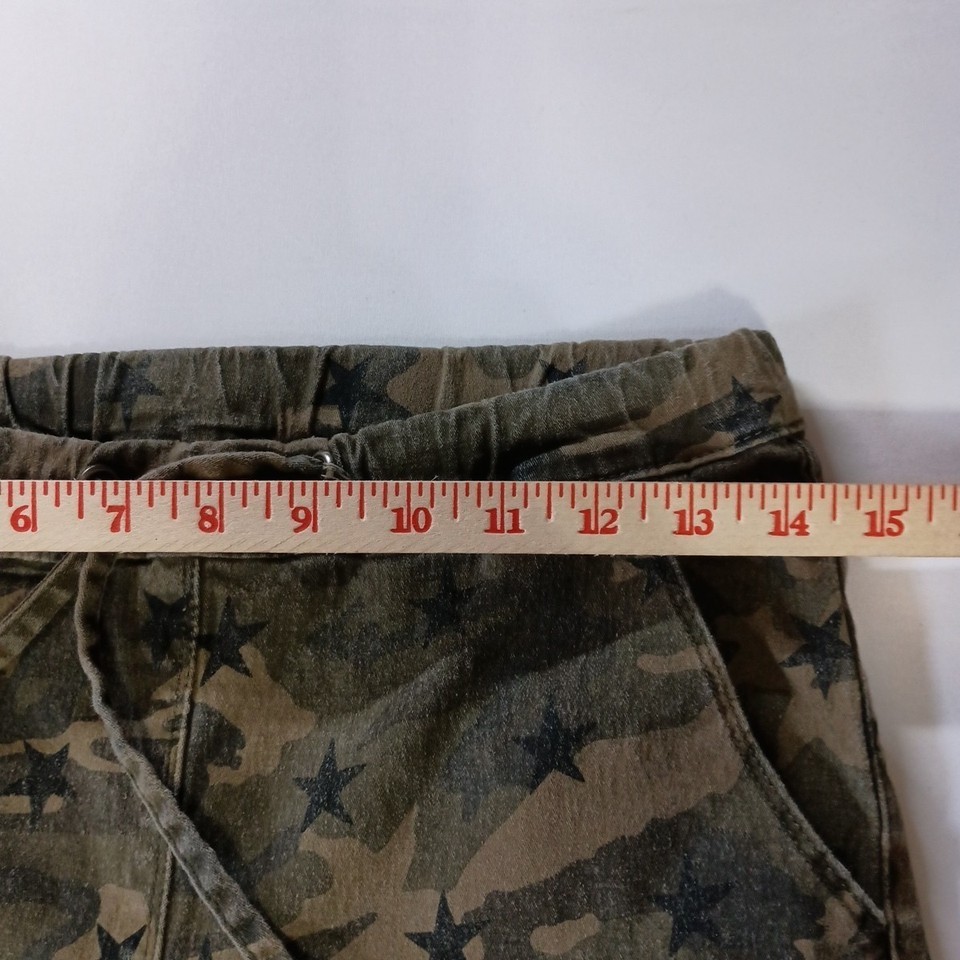 The American Bazi Women's Dark Green Camouflage Pants in size S are a stylish and versatile addition to any wardrobe. These tapered leg pants feature a pull on closure with a drawstring accent, making them easy to wear for casual or work occasions. Made of cotton and spandex, these machine washable pants have a flat front design with pockets for added functionality. The green camouflage pattern with stars adds a trendy touch, perfect for year-round wear in all seasons. Normal wear.