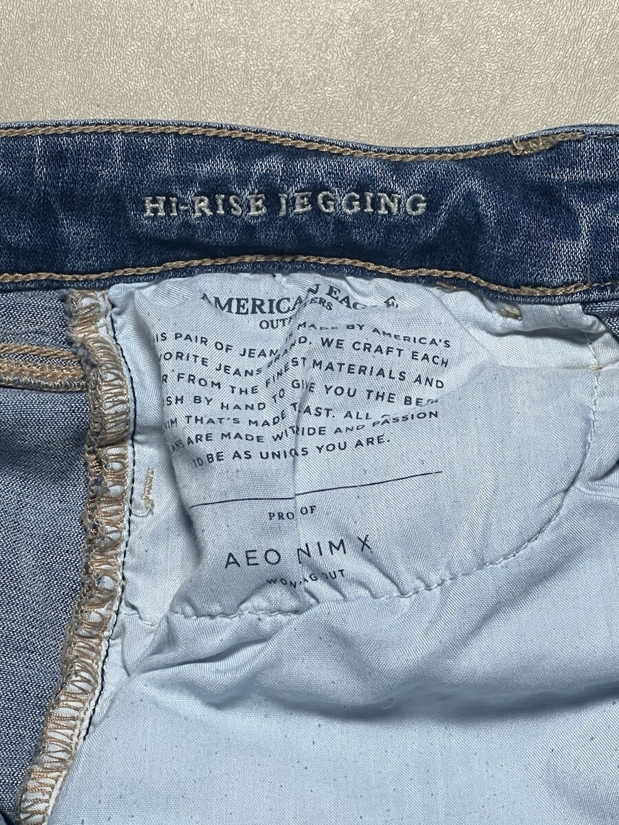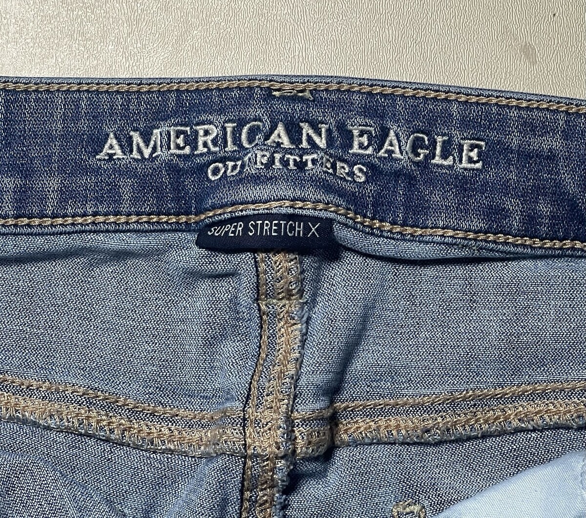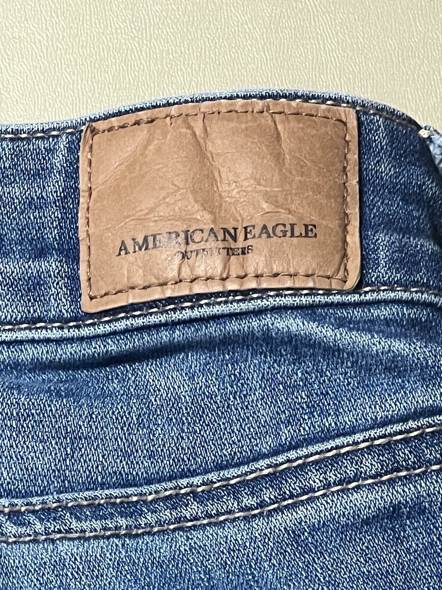 The American Eagle Outfitters Super Stretch X Hi-Rise Jeggings in women's size 6 regular are a comfortable and stylish option for everyday wear. These jeggings feature a high-rise waist and super stretch fabric for a flattering fit and ease of movement. The classic blue color and jegging style make them versatile for both casual and dressier occasions, perfect for any fashion-forward woman's wardrobe.