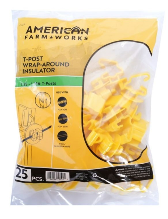 Fence insulators fit standard 1.25 and 1.33 in. studded T-posts One molded piece design eliminates the need for hardware for easy installation Compatible with poly wire, poly rope, or steel and aluminum wire UV-stabilized polyethylene construction gives the post insulator durability Pack of 25 for durability