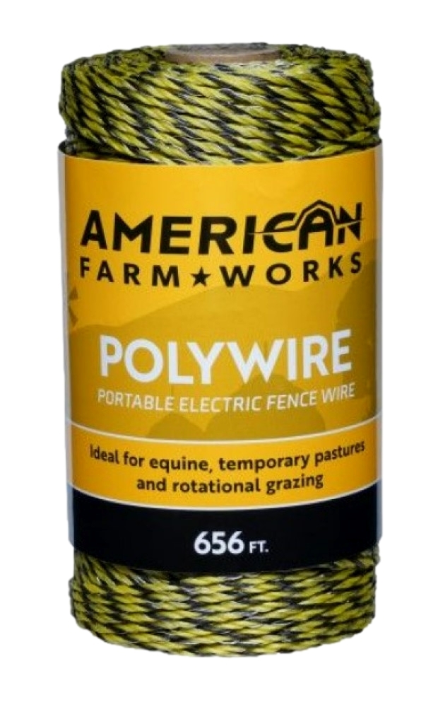 Ideal polywire for rotational grazing and temporary electric fencing Spool contains 656 ft. (200 m) of American FarmWorks polywire Woven with 6 strands of electrical conductors Breaking load: 180 lb. Lightweight poly fibers make it easy to install, repair and splice Durable poly fencing will not rust Please note: American FarmWorks polywire is not designed to function under extreme tension and must be used in conjunction with a permanent fence.