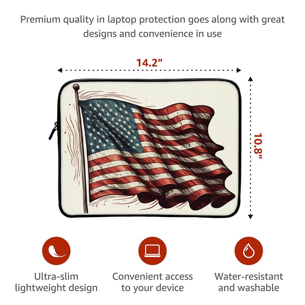 Bullet point: Dimensions: 14.2" x 10.8" x 1.25". A super soft sponge surrounds all bags, including the inner frame. Extra-thick pads at the corners provide 360 protection for your laptop from accidental scratches, and bumps. Slim and lightweight, American Flag Graphic features a soft sponge padding for cushioning and shock absorption and protects your device from dust, dirt, bumps, shocks, and accidental scratches.