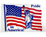 Image of American Flag waving on a flag pole with the Statue of Liberty in the middle and has the words Pride in America bracketing the top and bottom.