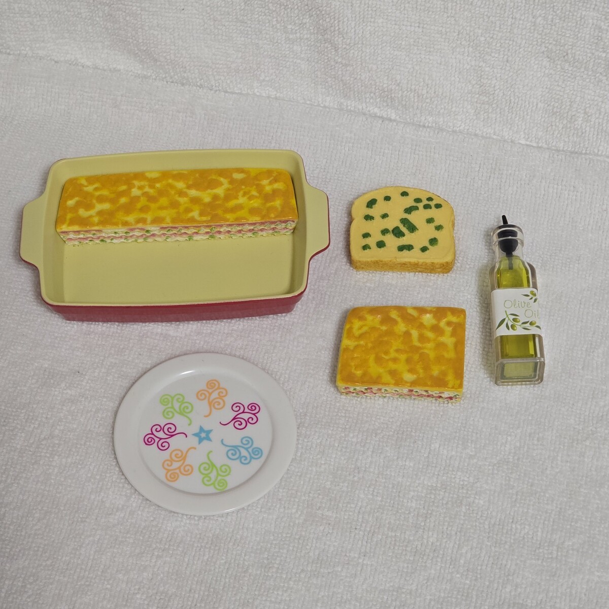 Items are genuine American Girl accessories with original markings (The garlic toast doesn't say American Girl)