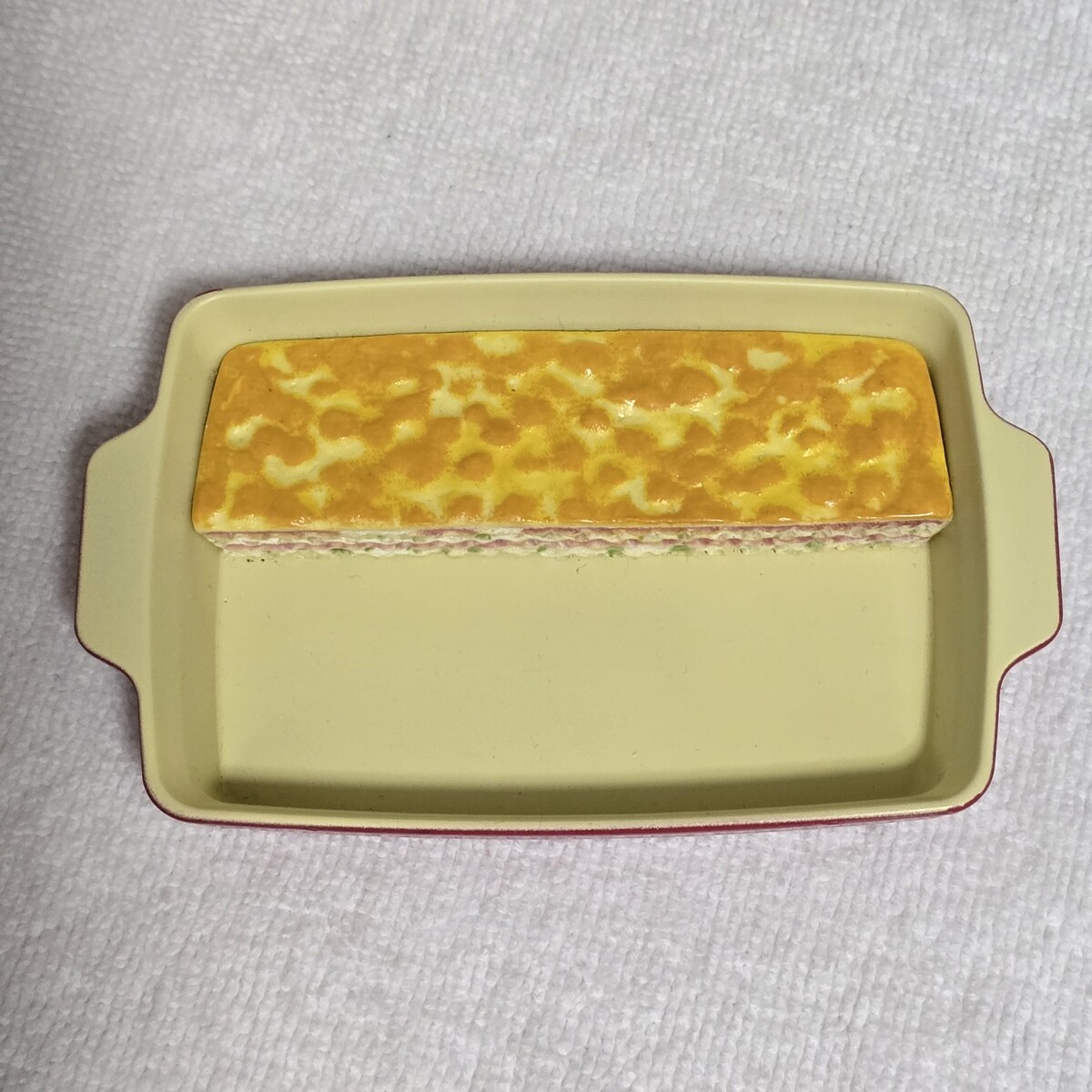 This set actually Includes: red casserole dish, quiche loaf with slices, colorful plate, and olive oil bottle, garlic toast