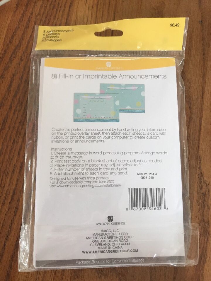 - American Greetings 8 Count Full- In Or Imprintable Announcement Ships N 24h
