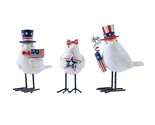 Celebrate patriotic pride with this charming set of Americana Bird Figurines. Featuring three delightful bird characters adorned with hats and firecracker accents, this whimsical trio adds a playful touch to your Independence Day or Memorial Day decorations. The vibrant red, white, and blue tones make these birds a standout addition to mantels, bookshelves, or tabletops. Crafted from durable polyresin and metal, these decorative birds promise long-lasting charm for years of seasonal displays. Sold in a set of three assorted designs to create a balanced and versatile display in your home.
