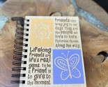 Spiral bound photo album with a decorative wooden cover featuring inspirational friendship quotes and simple graphics.