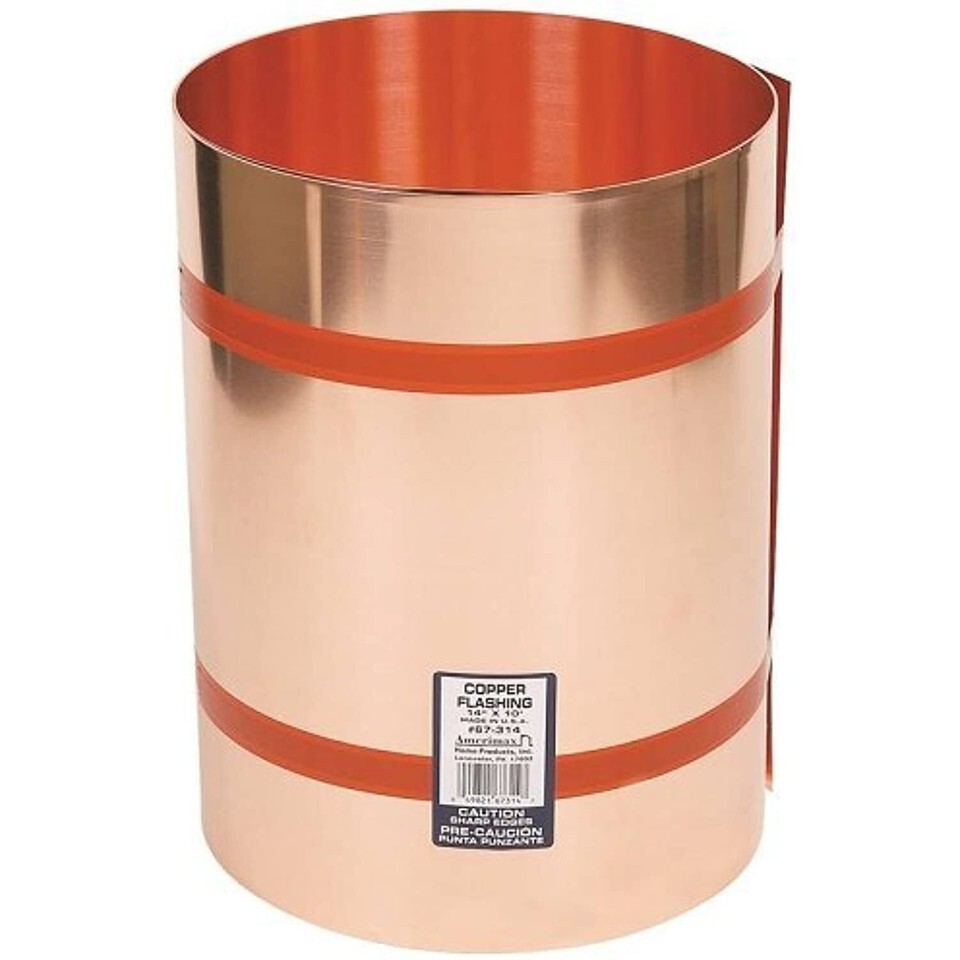Product Description Amerimax Valley flashing, 0.021 in thickness, 14 in width, 10 ft. Roll length, copper, 100 lb. Tensile. From the Manufacturer AMERIMAX HOME PRODUCTS 67314 14"x10' Copper Flashing. 14" x 10', Copper Flashing, 16 OZ, .021", For Use In Valleys, Roofing Material, Termite Shield Decorative Applications, Compatible With ACQ Lumber.