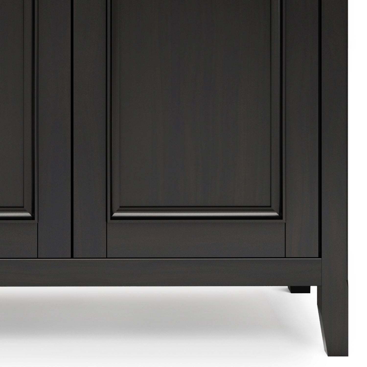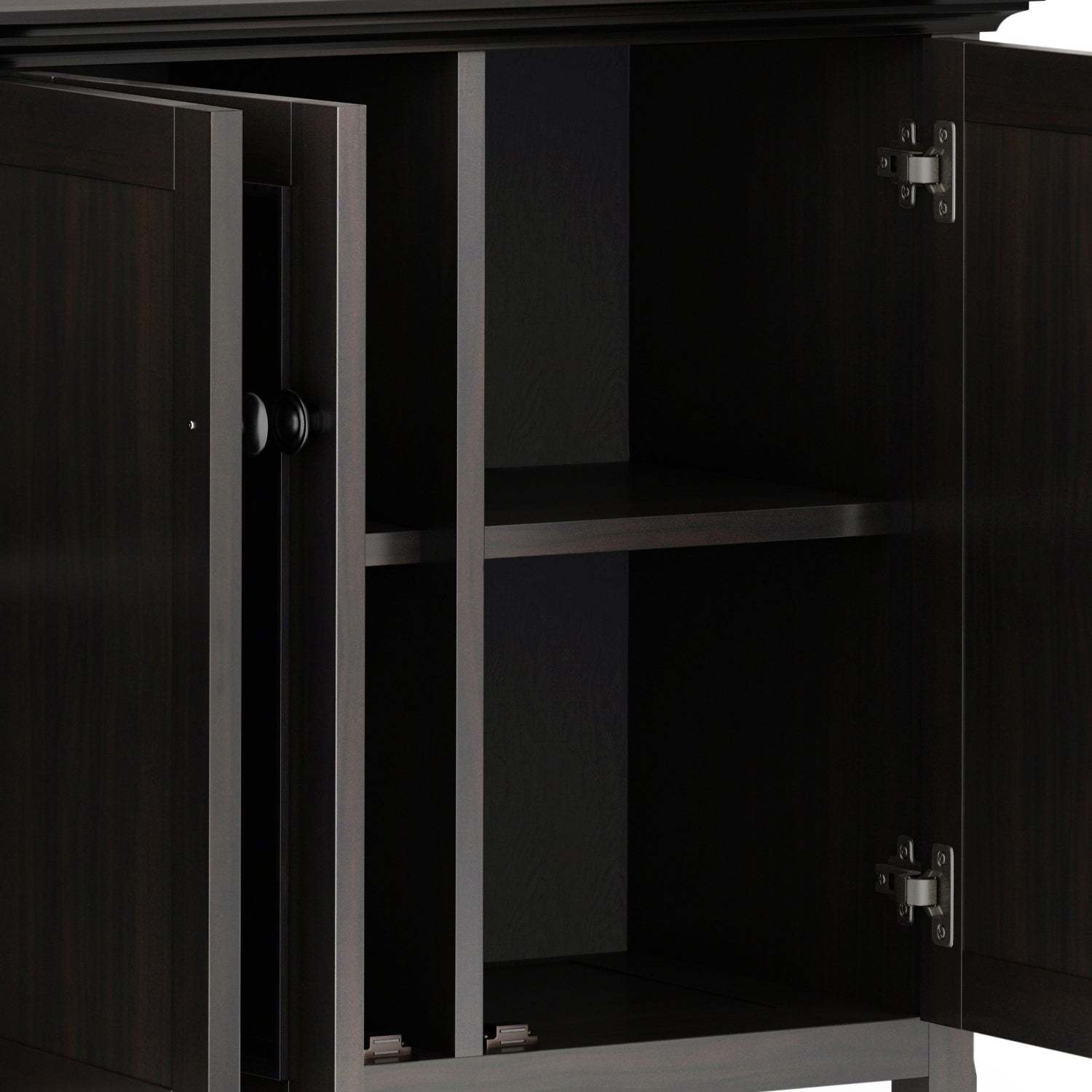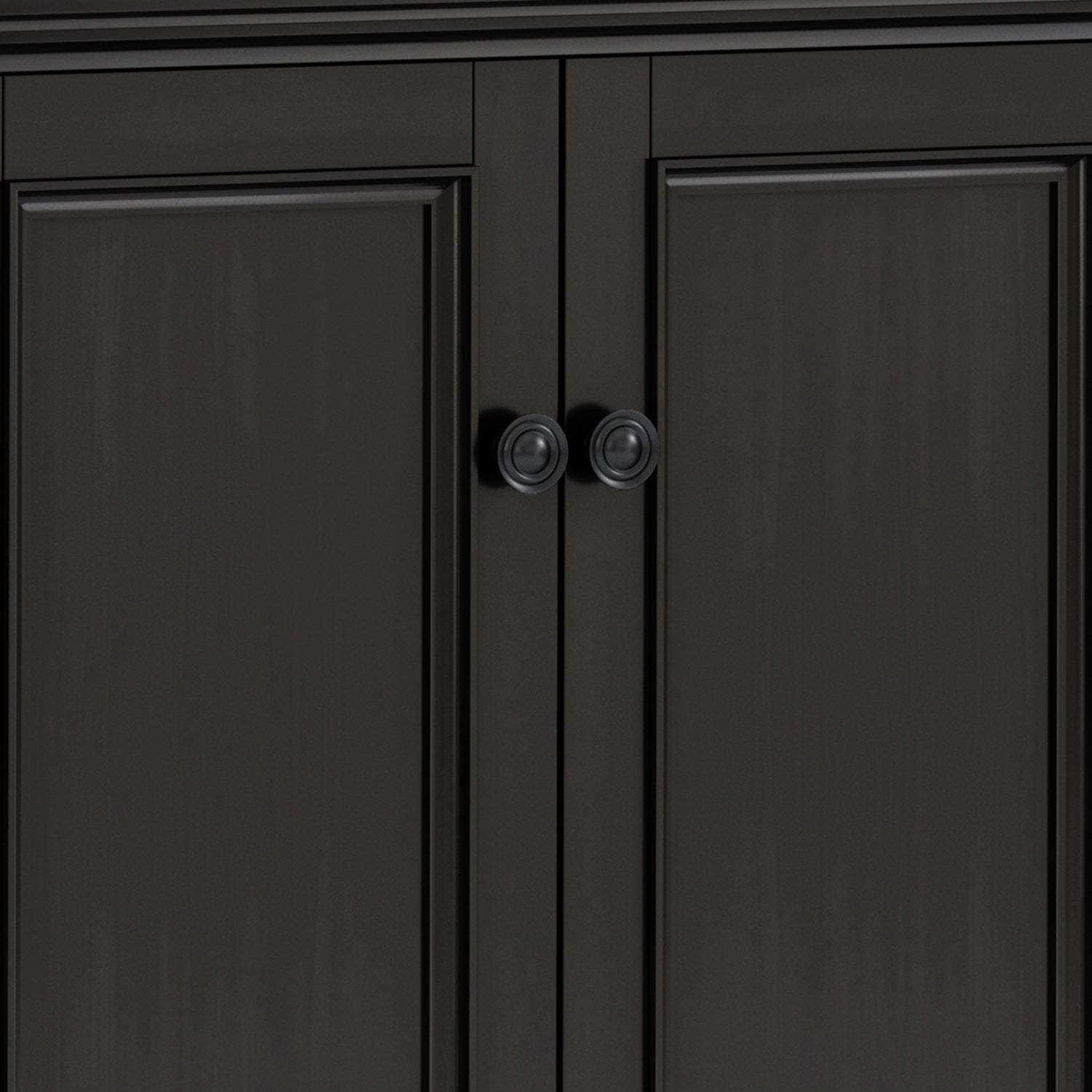 Ample Closed Storage: Behind four framed panel doors are spacious interior compartments with adjustable shelves - perfect for storing dishware, linens, board games, or household supplies.