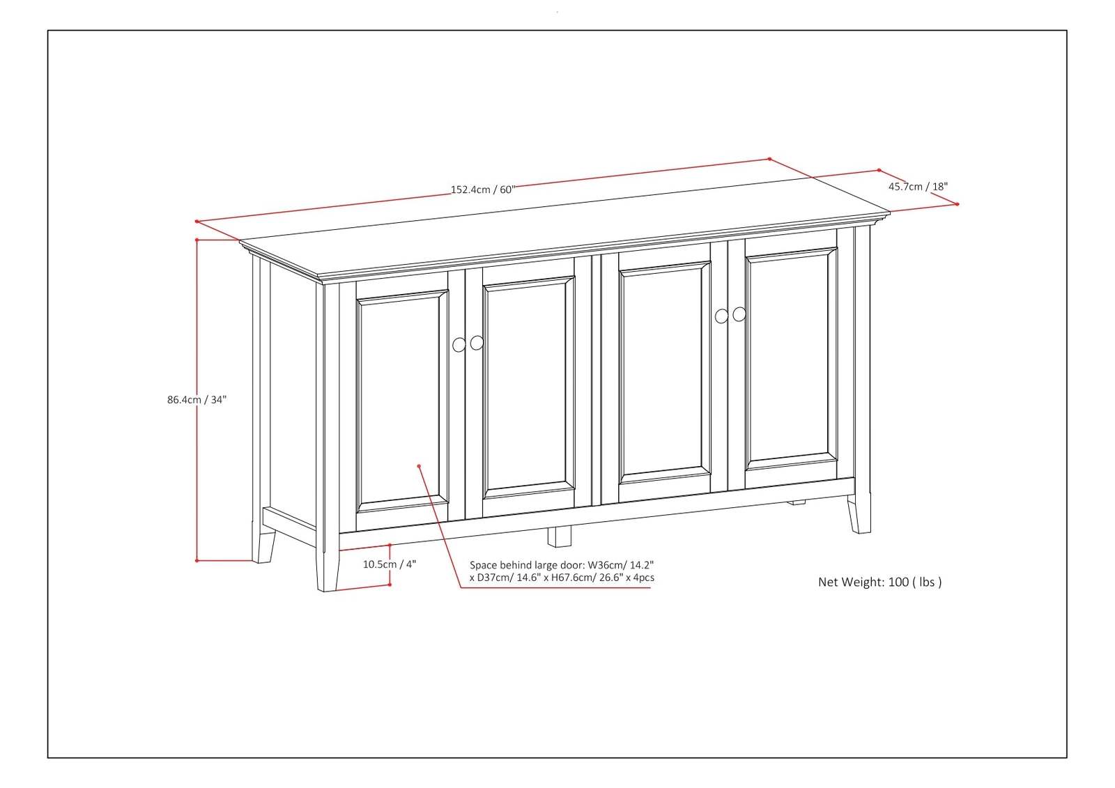 Dimensions: Measures 66' W x 18' D x 34' H; sized for use as a dining buffet, hallway storage cabinet, or living room sideboard - providing enclosed, adjustable storage wherever you need it.
