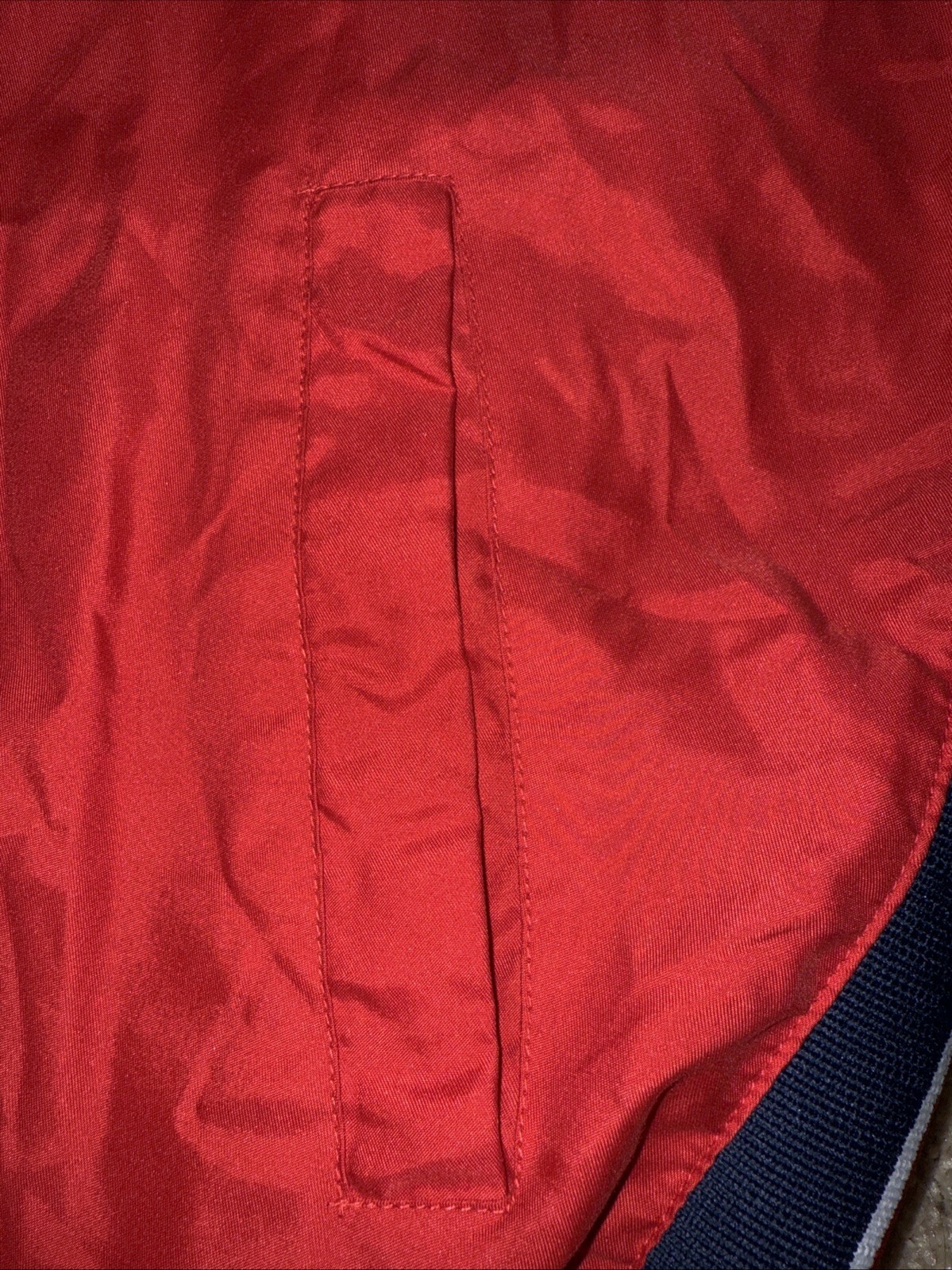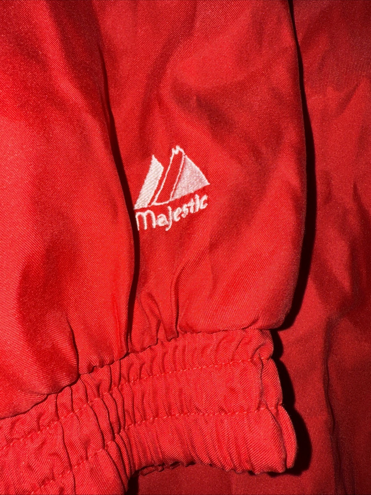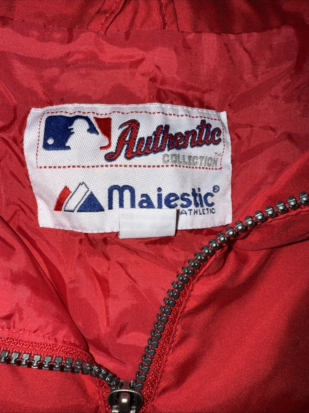 The Anaheim Angels Majestic Jacket is a stylish and comfortable pullover designed for fans of the Major League Baseball team. This jacket in size Large features the iconic team colors of red with a chest patch representing the Anaheim Angels. Made by the reputable brand Majestic, this jacket is perfect for showing off team spirit while staying warm. Whether at a game or just out and about, this MLB fan apparel is a must-have for any supporter of the Anaheim Angels.