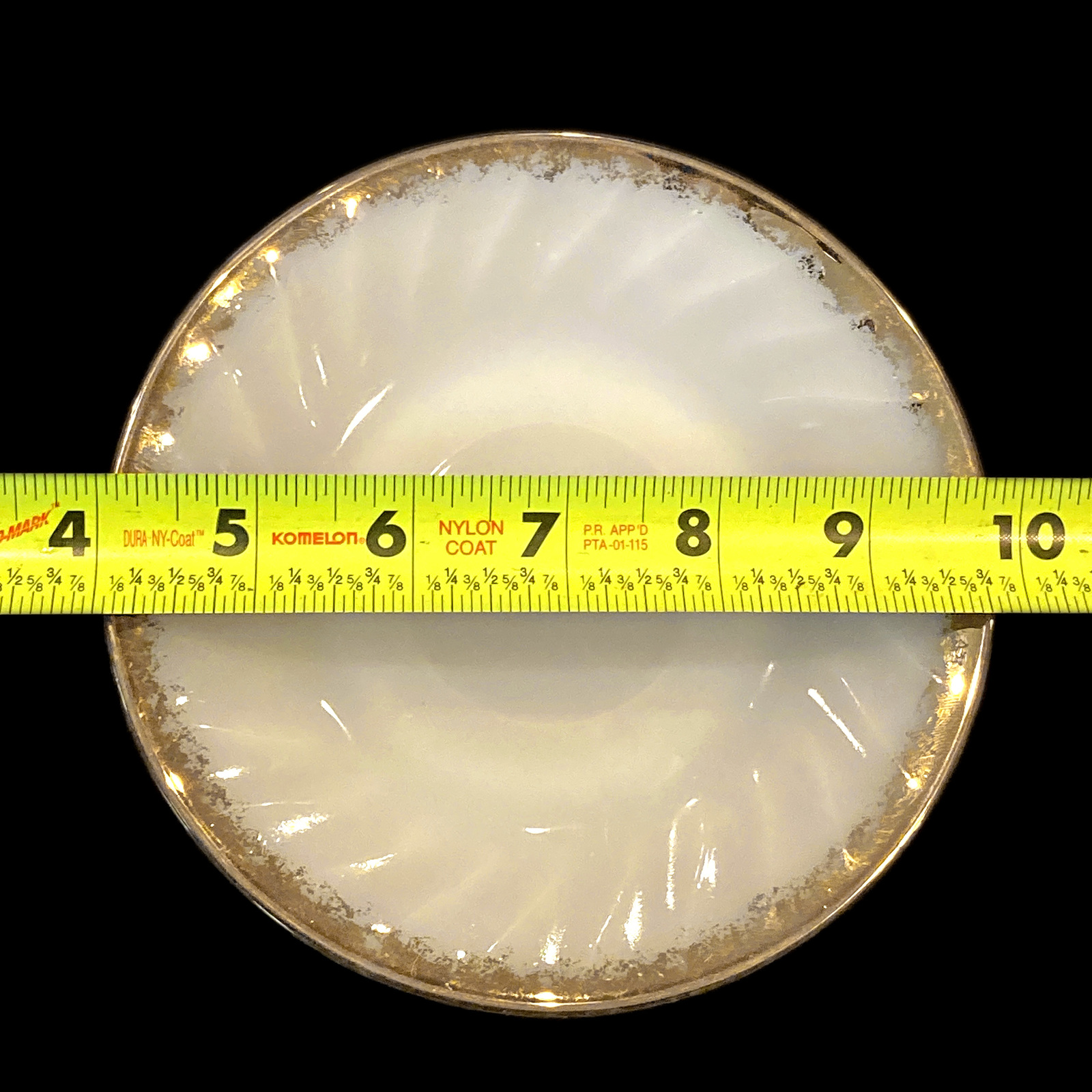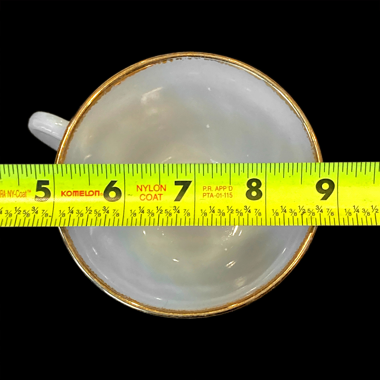 A late 1950s cup and saucer set by Anchor Hocking. Sold under the Fire-King brand, the Golden Anniversary pattern cup and saucer are Anchorwhite with 22K gold trim. The saucer measures 5.75" (14.61 cm) in diameter. The cup is 2.5" (6.35 cm) tall and is 3.875" (9.84 cm) in diameter.