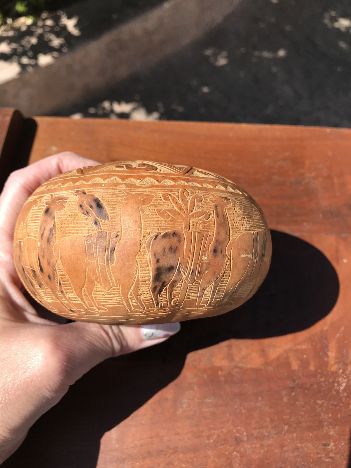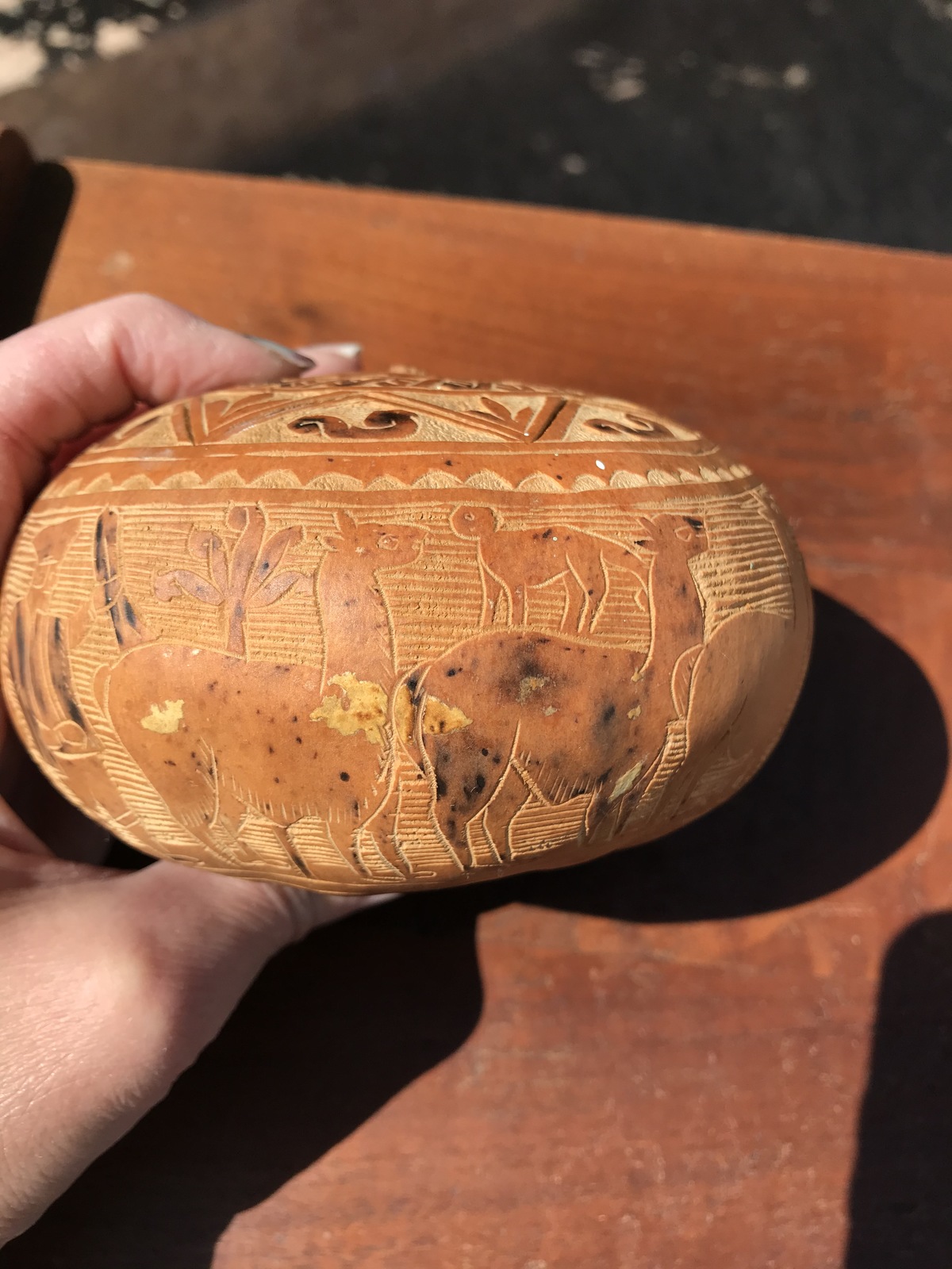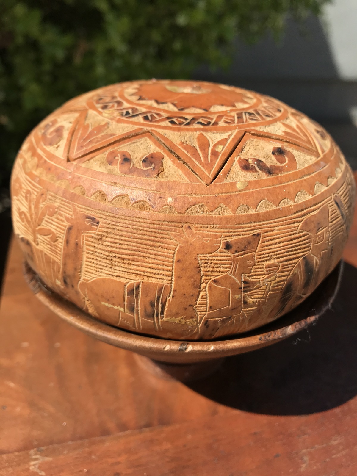 In the interest of honesty wandering into a completely unknown area, we really have no idea of telling if this beautiful gourd is ancient or not. Nor do we know exactly how old the beautiful handmade wooden bowl is that it is sitting in, it would be impossible to tell really. Our feeling is that it's pretty old because of the subject matter, but that's a guess. What we do know is that somebody took the time to carve these beautiful llamas, Lions, birds and what looks to be some type of Spanish conquistadors. One thing is for certain, whoever carved these images was a very capable artist because they're really done quite well, especially for imagery carved into a gourd which is so delicate.