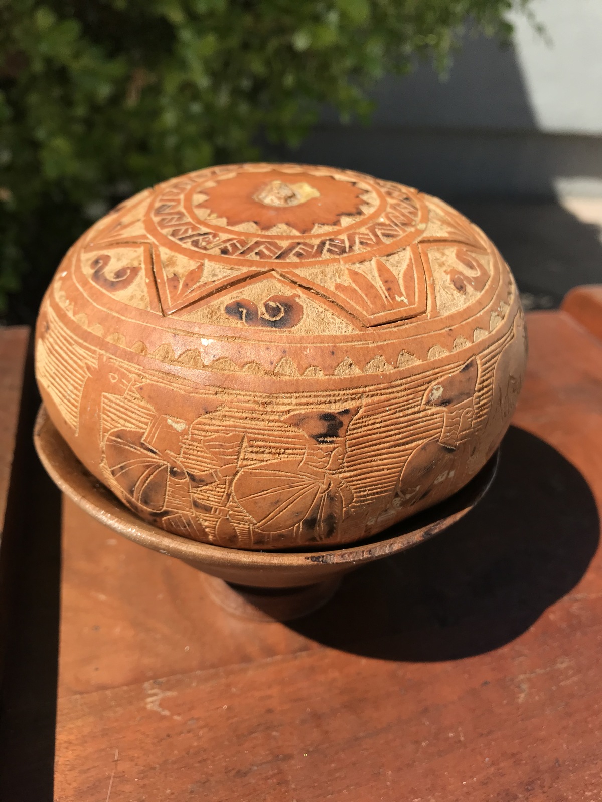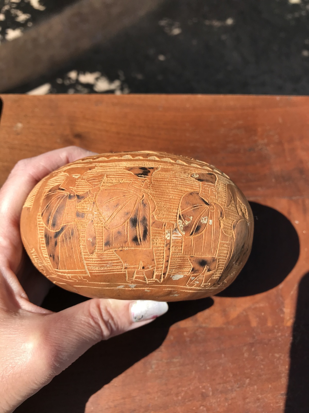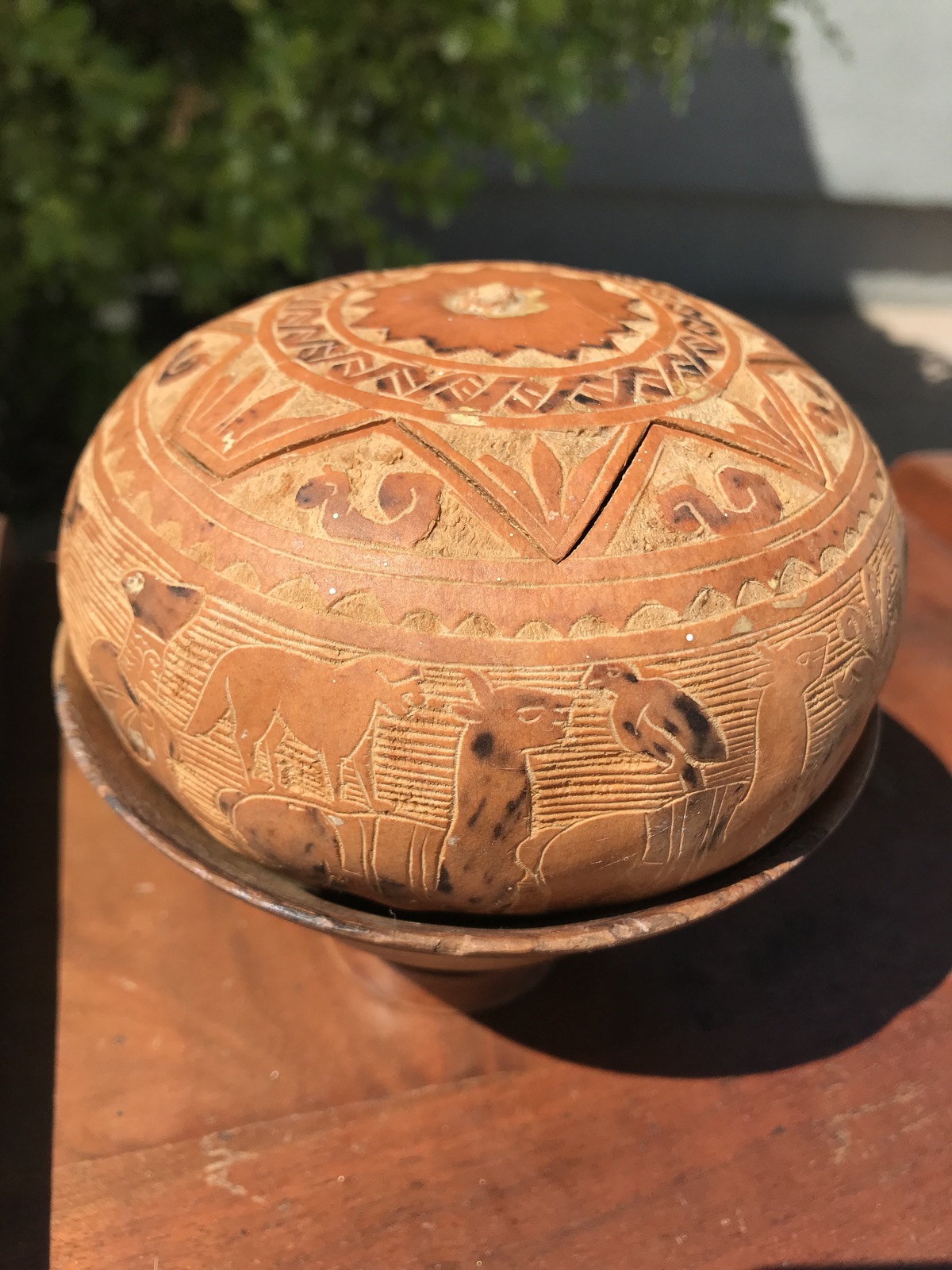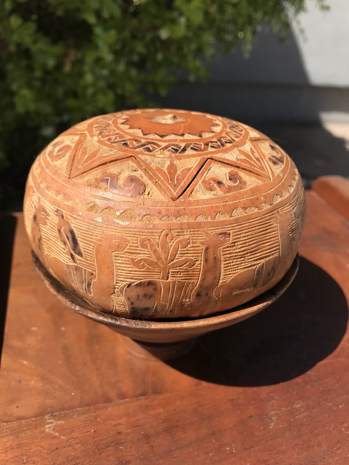 In the interest of honesty wandering into a completely unknown area, we really have no idea of telling if this beautiful gourd is ancient or not. Nor do we know exactly how old the beautiful handmade wooden bowl is that it is sitting in, it would be impossible to tell really. Our feeling is that it's pretty old because of the subject matter, but that's a guess. What we do know is that somebody took the time to carve these beautiful llamas, Lions, birds and what looks to be some type of Spanish conquistadors. One thing is for certain, whoever carved these images was a very capable artist because they're really done quite well, especially for imagery carved into a gourd which is so delicate.