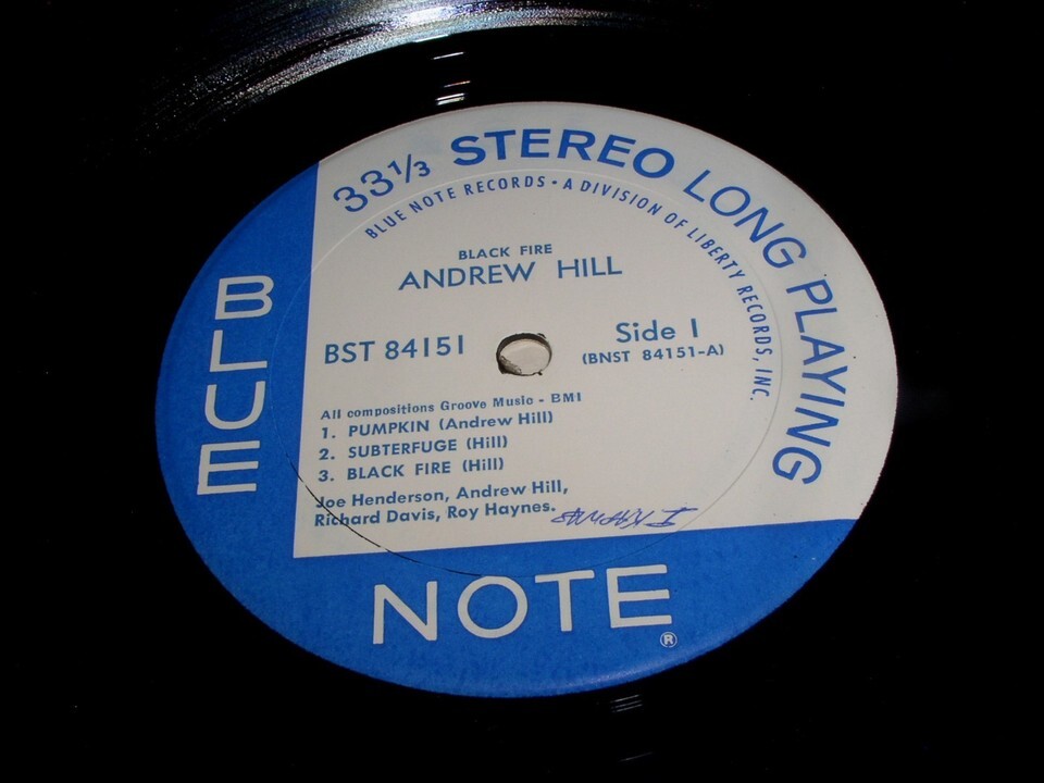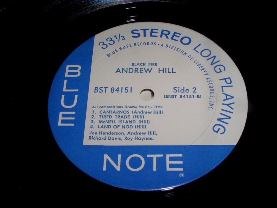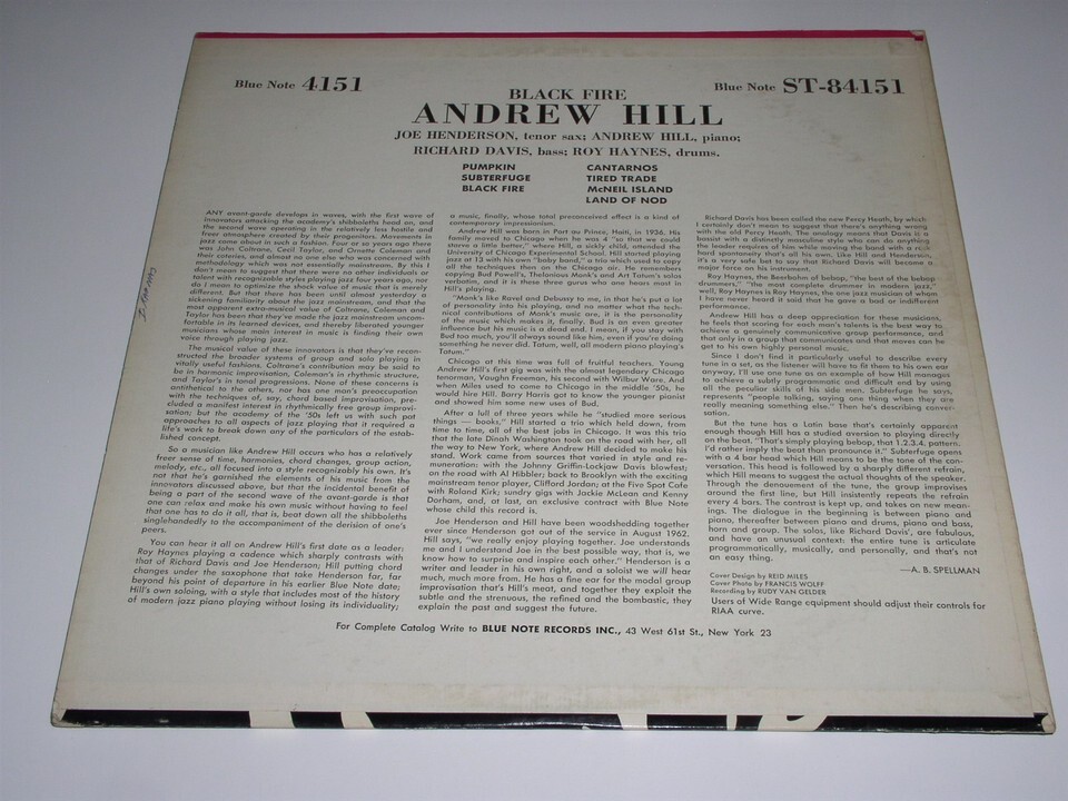 This is a rare, vintage phonograph record album by Andrew Hill, entitled "Black Fire". Joe Henderson, Richard Davis, Roy Haynes. Record label: Blue Note 84151 (Stereo). Van Gelder is stamped in the matrix.