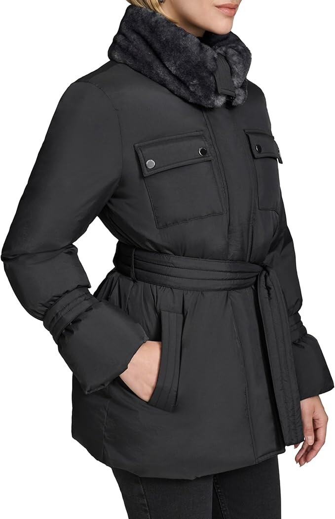 - Andrew Marc Womens Belted Jacket With Soft Faux Fur Collar
