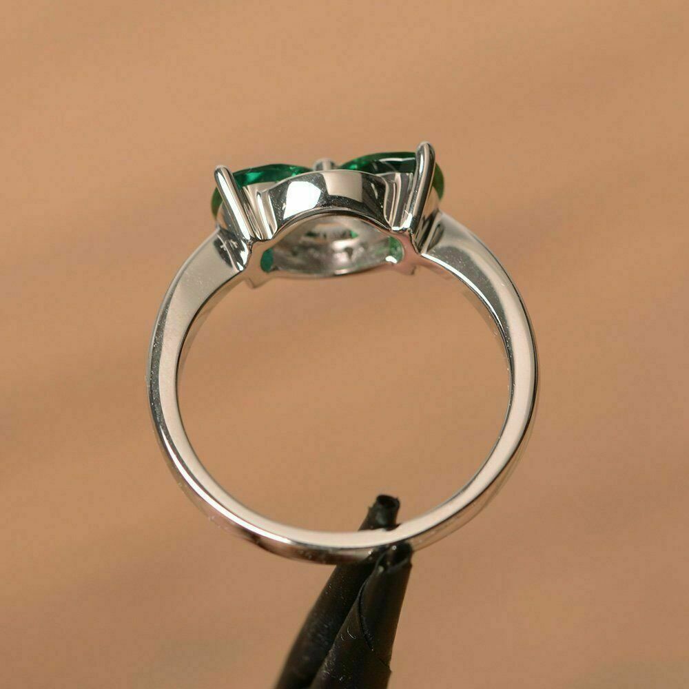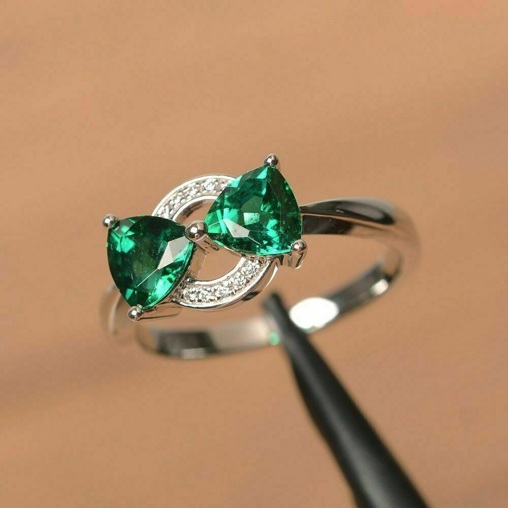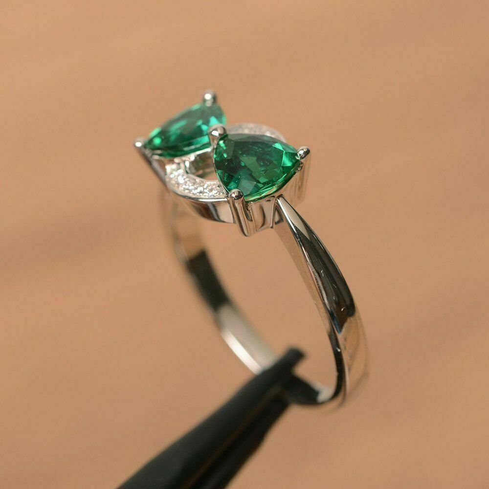 - Anello di fidanzamento con due pietre di smeraldo verde taglio trilioni di...