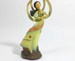This is an EUC, Excellent Used Condition, contemporary style angel holding a bird in her hand. She is standing on textured looking ground. Her wings are uniquely curved. The way she is standing gives you a sense of a passing breeze. The tiny bird in her hand has a detailed face. The angels' gown is in shades of pale yellow pale green accented with tiny pin dots and 2 stars of brown. Her sash is a golden tan and her hair is a dark brown. Her face shows compassion for the bird. This is a very beautiful piece of art either for yourself or as a gift. No chips, stains or cracks.