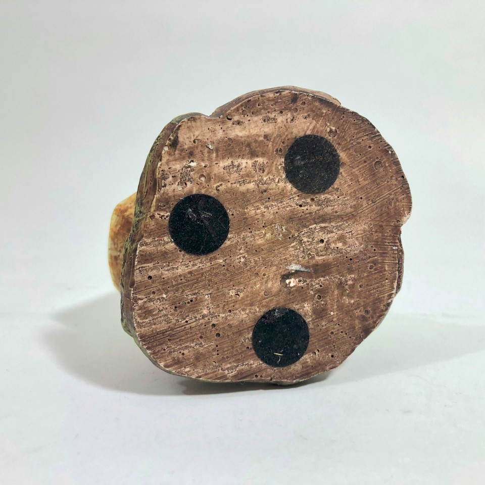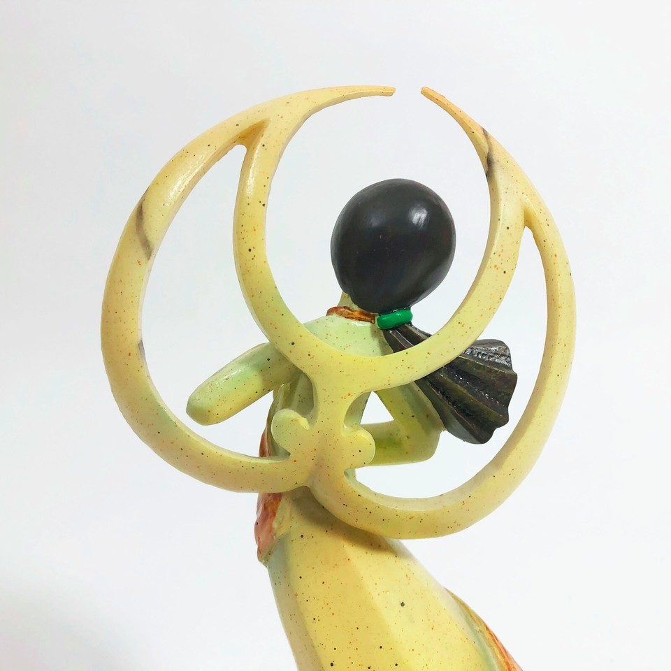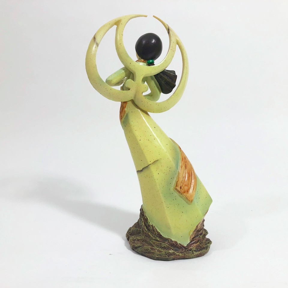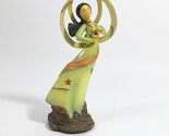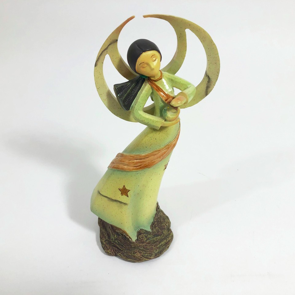This is an EUC, Excellent Used Condition, contemporary style angel holding a bird in her hand. She is standing on textured looking ground. Her wings are uniquely curved. The way she is standing gives you a sense of a passing breeze. The tiny bird in her hand has a detailed face. The angels' gown is in shades of pale yellow pale green accented with tiny pin dots and 2 stars of brown. Her sash is a golden tan and her hair is a dark brown. Her face shows compassion for the bird. This is a very beautiful piece of art either for yourself or as a gift. No chips, stains or cracks.