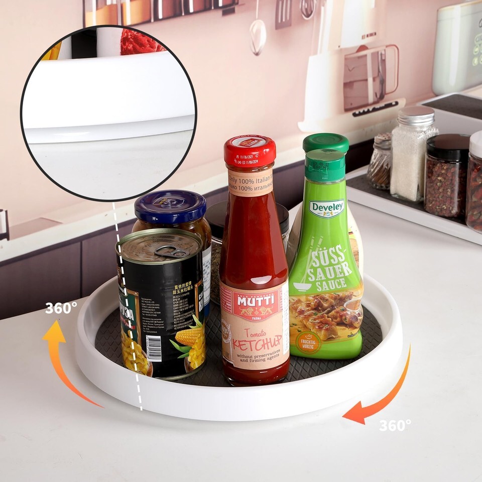 The outer edge can prevent items from falling off, and the anti slip surface can fix items in place when rotating. Durable and easy to clean polypropylene with anti slip bead like surface