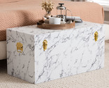 Features: Faux Marble Exterior: Wrapped in a marble-inspired vinyl for a sleek, stylish look Durable Construction: Constructed from Engineered Wood and wrapped in printed PVC laminate Lift-Top Mechanism: This trunk opens to reveal a spacious storage compartment perfect for organizing a variety of items Industrial Adornments: Metal latches and locks add a refined touch to the modern style of the piece Chic and Multipurpose Storage: Great for storing blankets and pillows for frequent use or as a chic long term storage solution Arrives Fully Assembled- This storage trunk arrives ready for use Set Includes: One (1) Storage Trunk